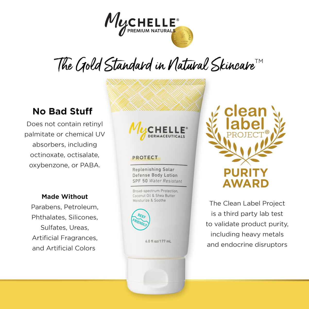 Protect your skin from the sun with Mychelle Dermaceuticals Sun Protection Replenishing Solar Defense Body Lotion. This replenishing lotion provides essential sun protection while keeping your skin hydrated and nourished.