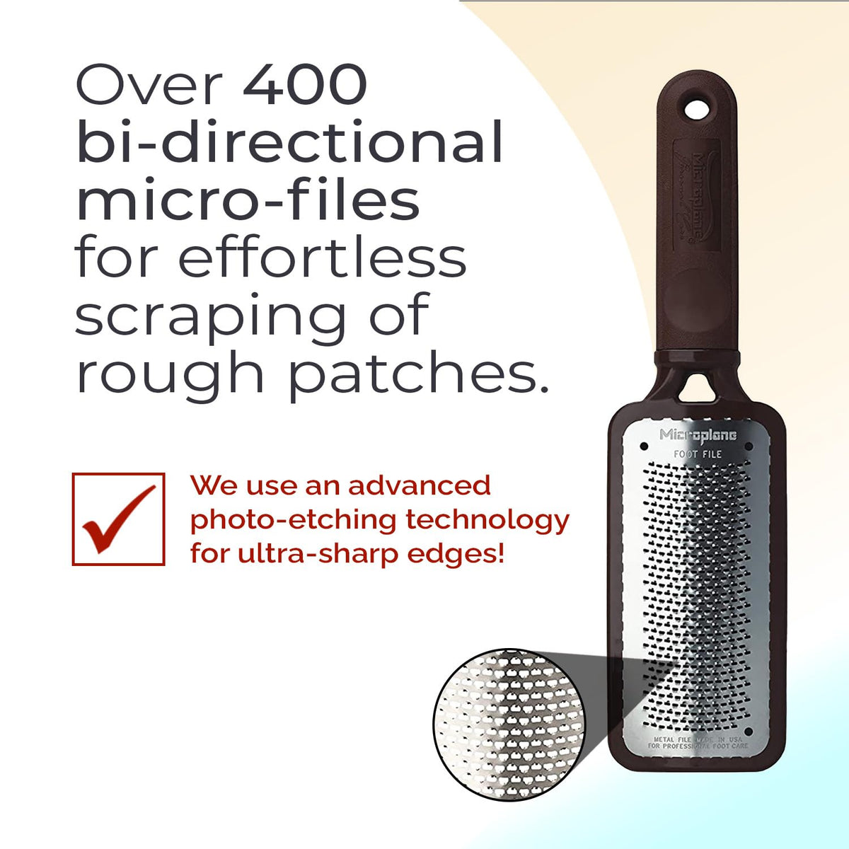 Transform your foot care routine with the Microplane Colossal Foot File Scraper. This stainless steel foot rasp effectively removes dead skin and calluses, providing salon-quality foot care at home.