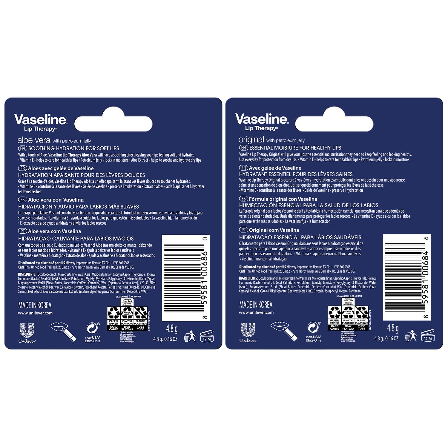 Keep your lips moisturized with Vaseline Lip Therapy Variety 4-Pack. This set includes Original and Aloe Vera lip balms enriched with Vitamin E for soft, hydrated lips.