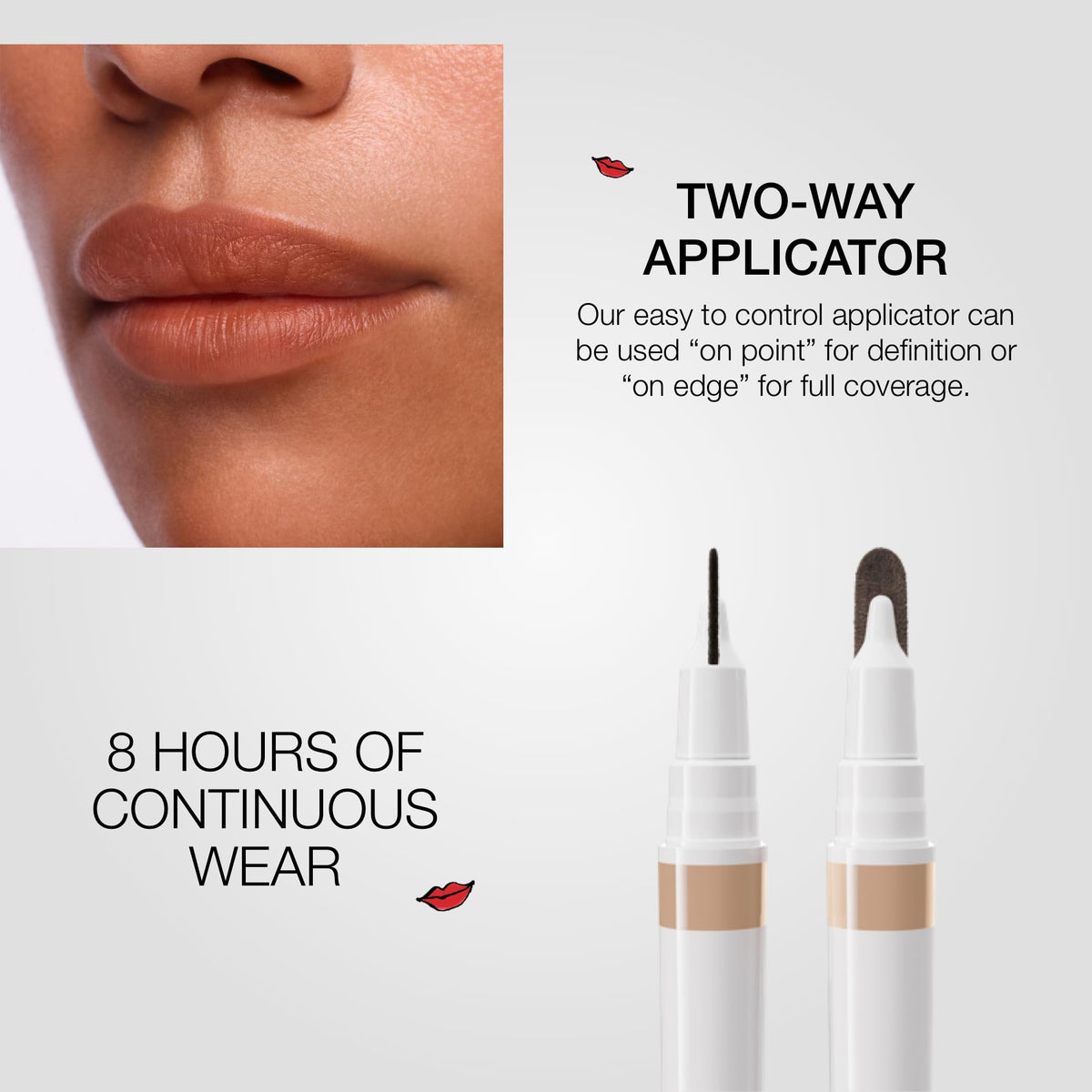 Exfoliate lips prior to use. Using both pressure and application angle, apply on point to line, contour, and define your lips, or on edge for full wash of lightweight coverage and even color distribution. Store tip side down or horizontally for best performance.
