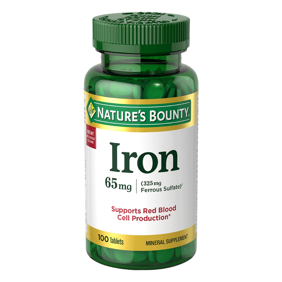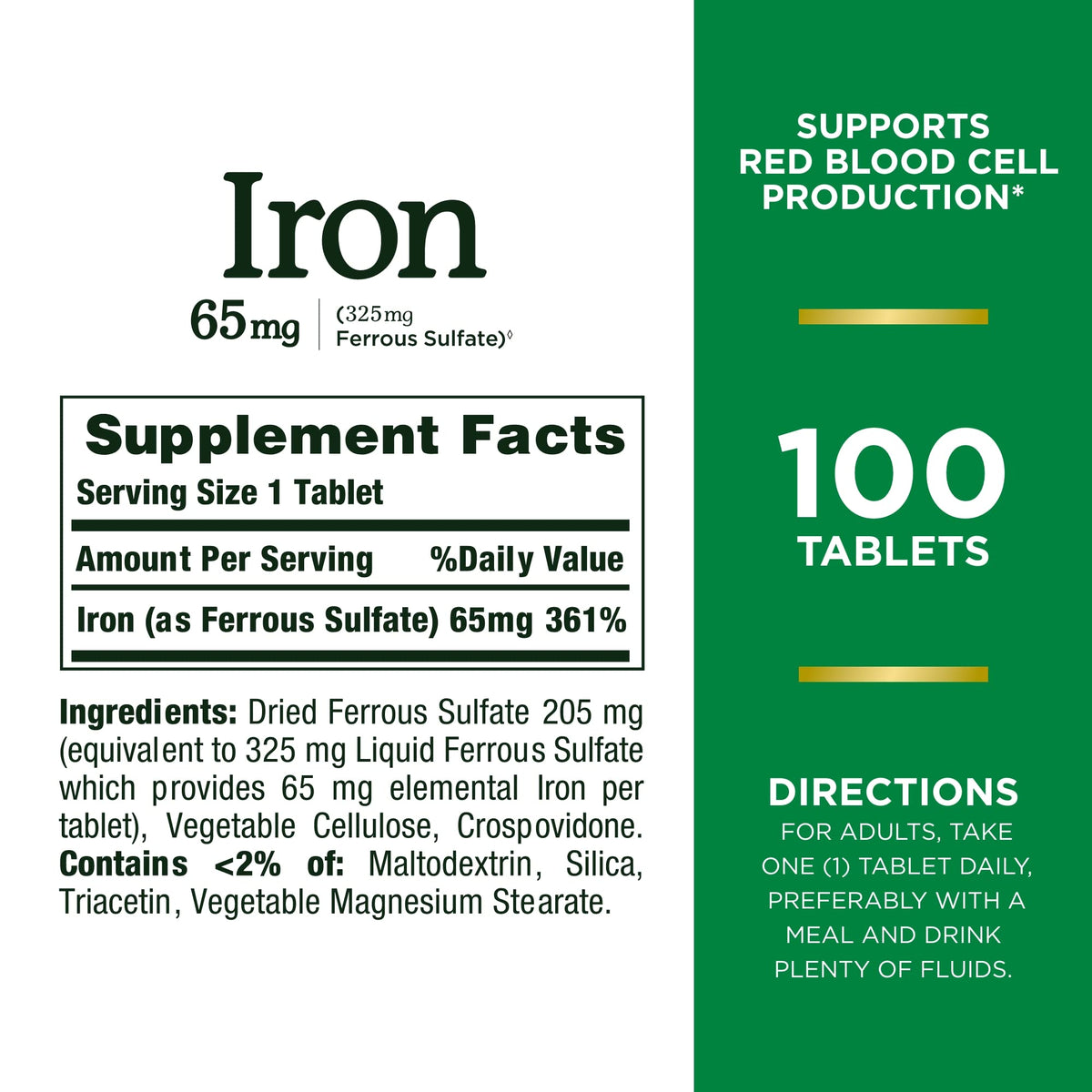 Nature's Bounty Iron 65mg, 325 mg Ferrous Sulfate, Cellular Energy Support, Promotes Normal Red Blood Cell Production, 100 Tablets