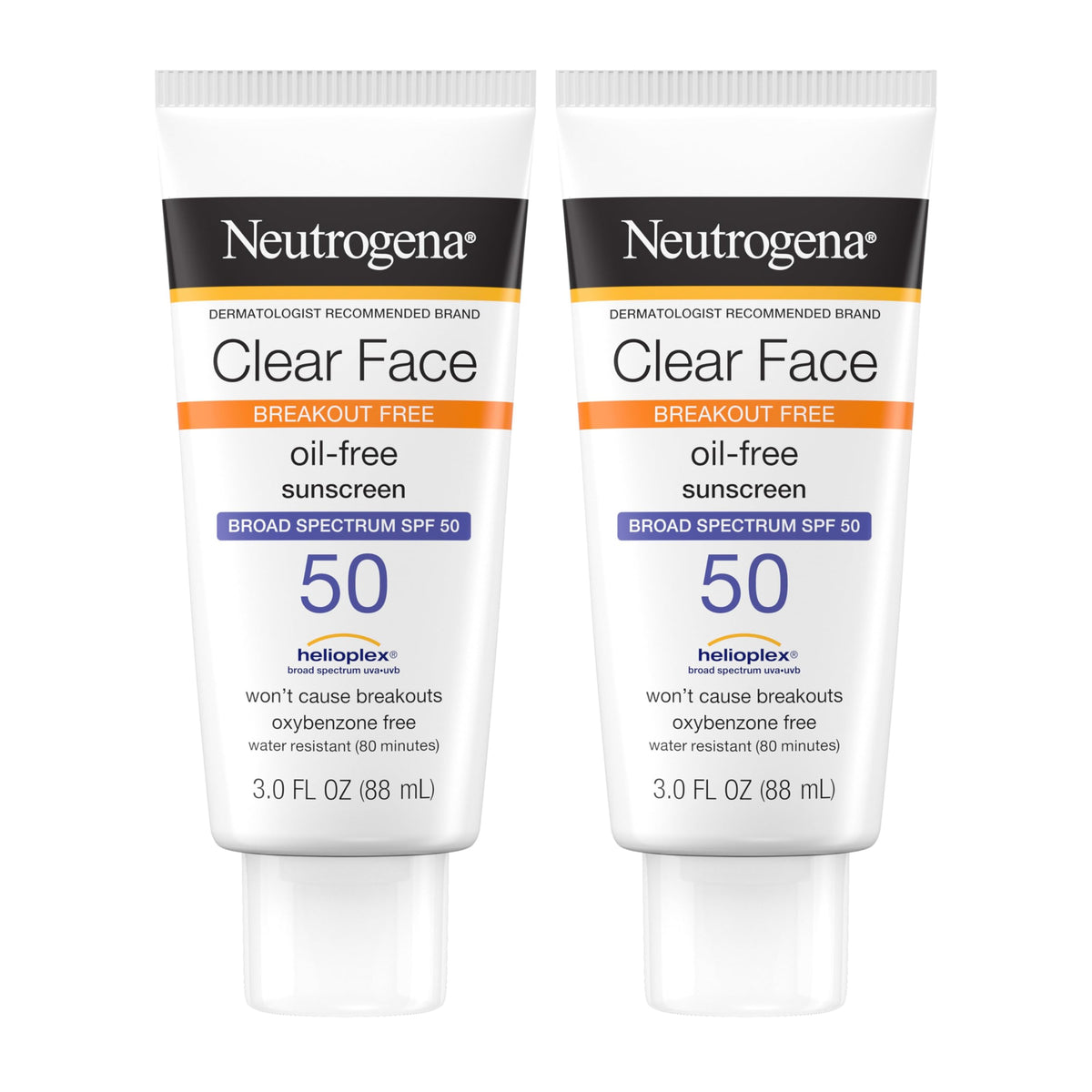 Neutrogena Clear Face Sunscreen Lotion for Acne-Prone Skin, Broad Spectrum SPF 50 Facial Sunscreen for Oily Skin, Oil-, Fragrance- & Oxybenzone-Free Water Resistant Sunscreen, Twin Pack, 2 x 3 fl. oz