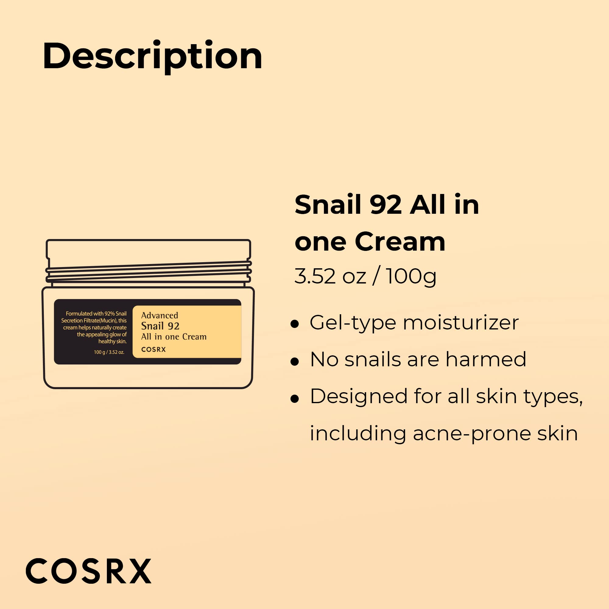 COSRX Snail Mucin 92% Face Moisturizer, 3.52 Oz, Lightweight Moisturing Cream for Soft, Glowy Skin, Korean Skin Care, Korean Moisturizer Face Cream