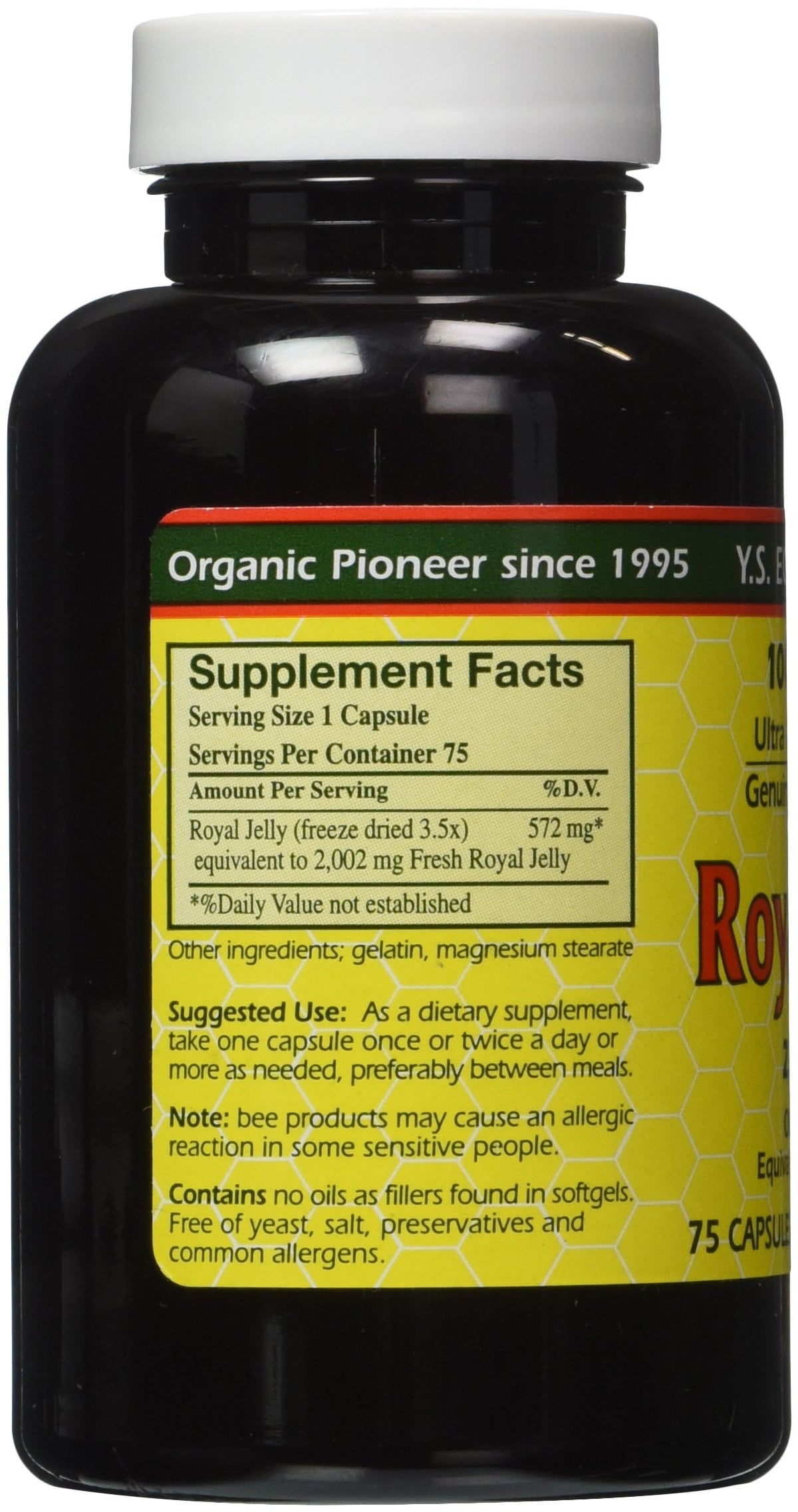 100% Pure Freeze Dried Fresh Royal Jelly by YS Eco Bee Farms offers 2000 mg in 75 capsules. This royal jelly supplement is a natural source of nutrients.