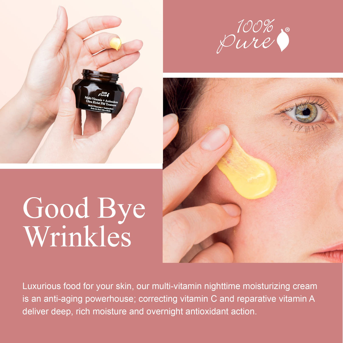 100% PURE Multi-Vitamin + Antioxidants Ultra Riche PM Treatment Skin Renewing Night Cream is a powerful anti-aging moisturizer with Vitamin C & Retinol. Replenish your skin's moisture and combat signs of aging with this 1.5 oz cream.