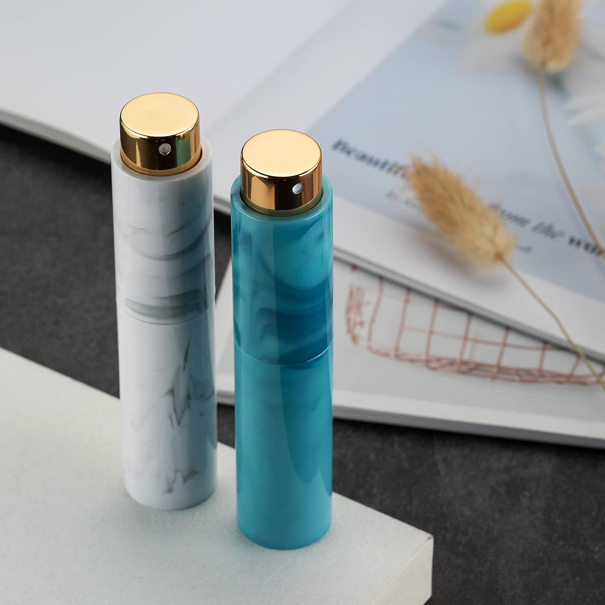 10ML Perfume Atomizer Travel (4 PCS), Refillable Cologne Containers, Dispenser Spray Empty Bottle for Mini Sprayer Size (Black&Pink&White&Blue, Marble)