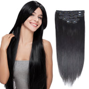 16" Clip in Hair Extensions made of real human hair in Jet Black(#1) offer a double weft for thickness and volume. With 6 pieces totaling 70 grams/2.45oz, these extensions provide a seamless and natural look.