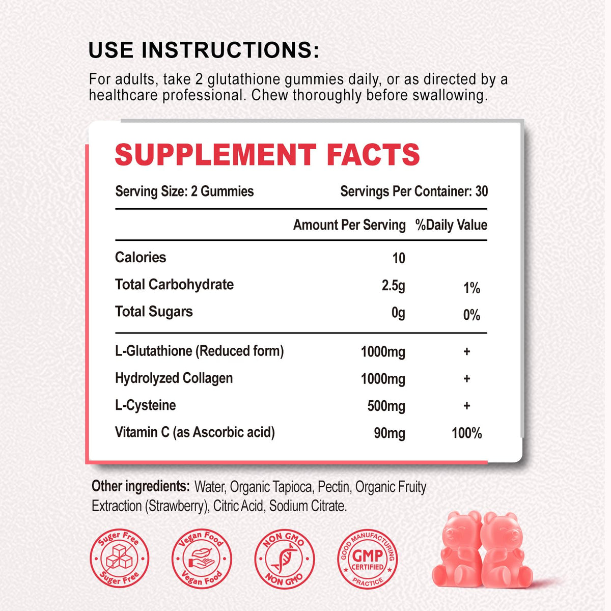 Promote healthy hair, skin, nails, muscles, and joints with 2 Pack Glutathione Collagen Gummies enriched with Vitamin C. These vegan, sugar-free gummies come in a delicious strawberry flavor.