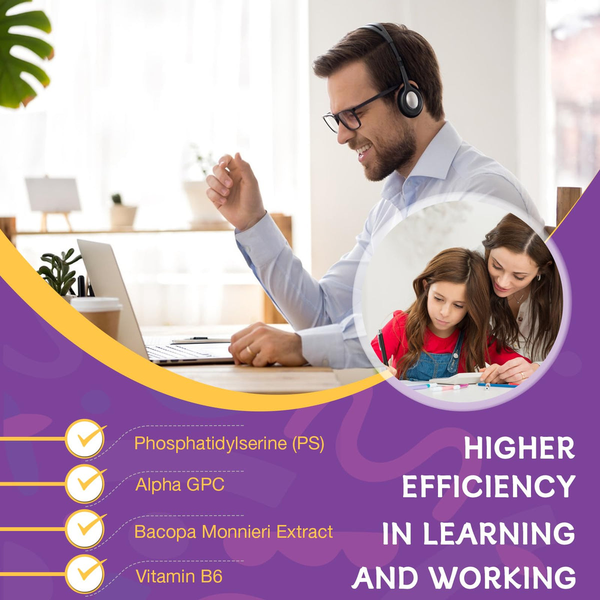 Ingredients: Phosphatidylserine, Alpha GPC, Bacopa Monnieri Extract, Vitamin B6, Vitamin B12, Folic Acid, Ginkgo Leaf Extract, Citicoline, Panax Ginseng Root Extract, Lutein and Zeaxanthin