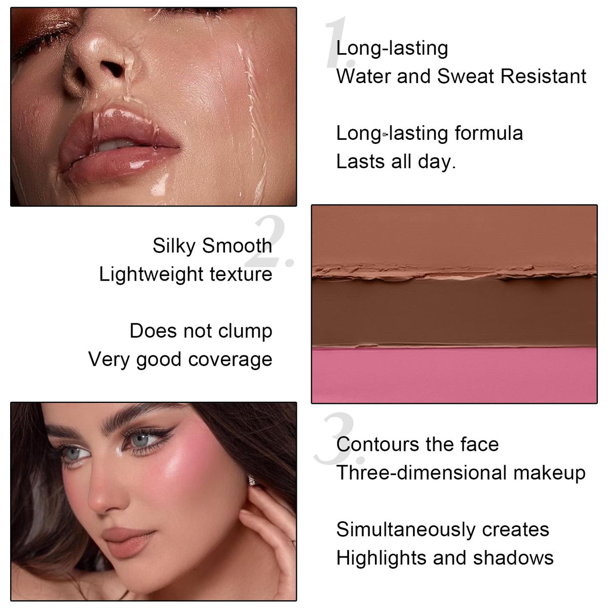 Apply the lighter end of the stick to areas where you want highlights, such as brow bones, temples, and the bridge of the nose. Use the darker end to create shadows and contours on areas like the cheeks, jawline, and forehead. Blend well for a natural finish.