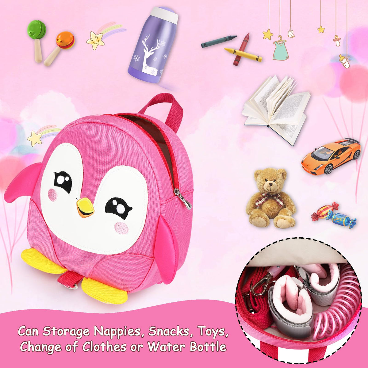 Accmor Toddler Harness Backpack Leash, Cute Penguin Kid Backpacks with Anti Lost Wrist Link, Mini Child Backpack Harness Leashes Walking Wristband Rope Travel Bag Harness Rein for Baby Girls (Pink)