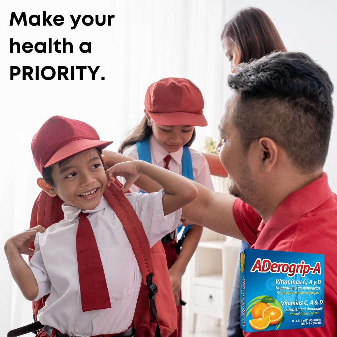 ADEROGRIP-A Aderogripa Immune Support Vitamins C, A & D | Liquid Supplement | 10 Natural Orange Flavor Ampoules | Boost Your Immune System | Box of 10 x 10ml Ampoules | Suplemento en Ampolletas