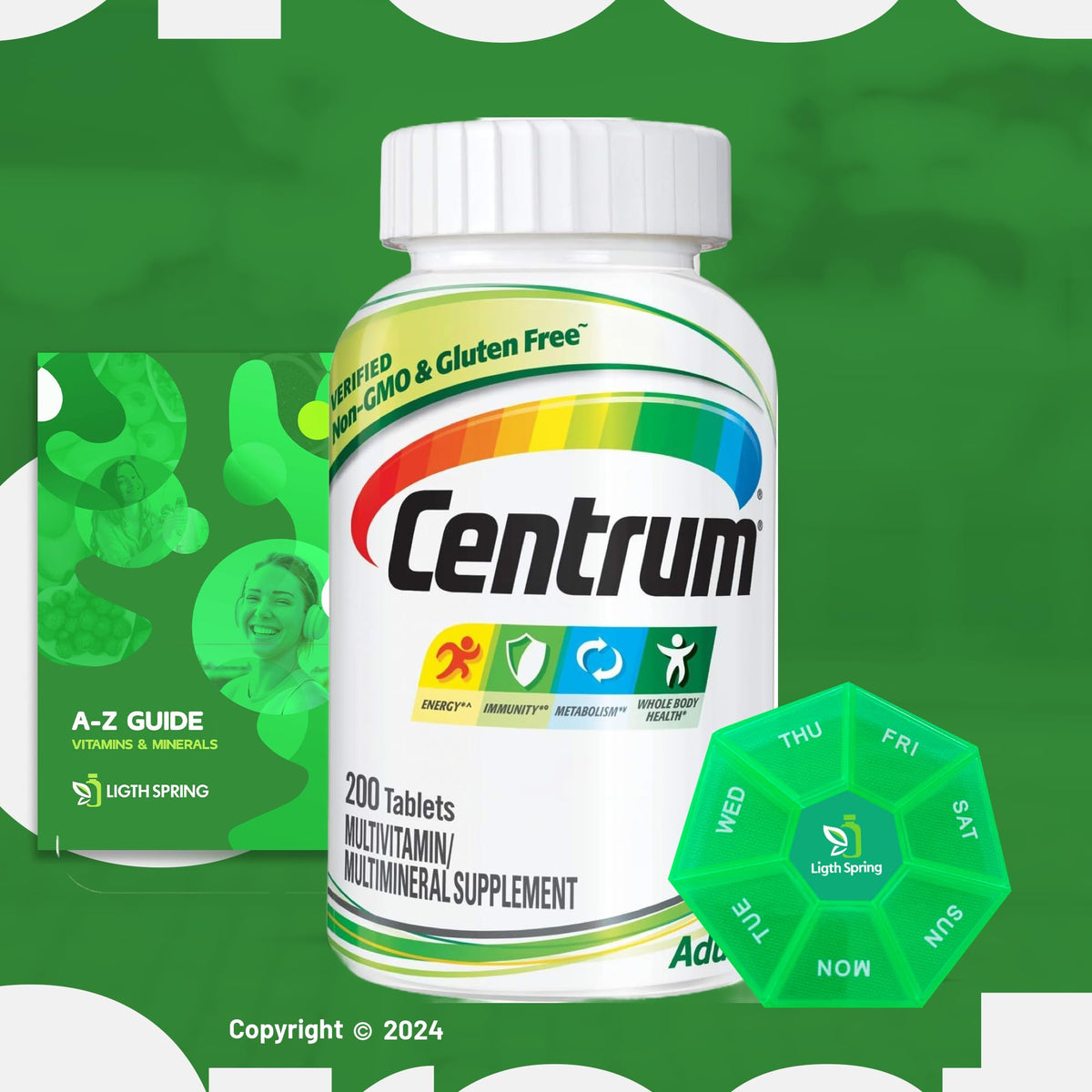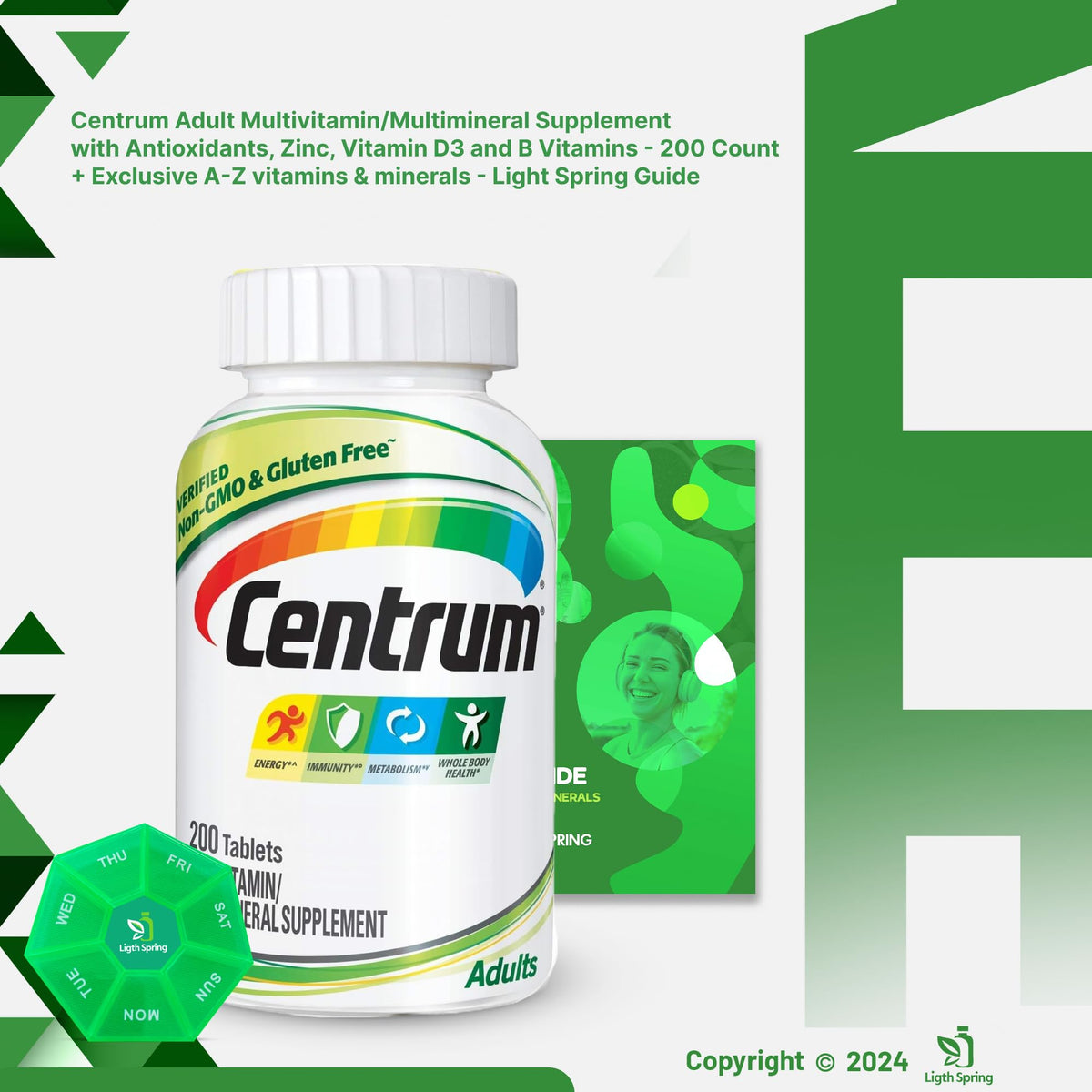 Adult Multivitamin/Multimineral Supplement with Antioxidants, Zinc, Vitamin D3 and B Vitamins 200 Tablets with Weekly Pill Organizer, A to Z Ligth&Spring Guide (3 Items)