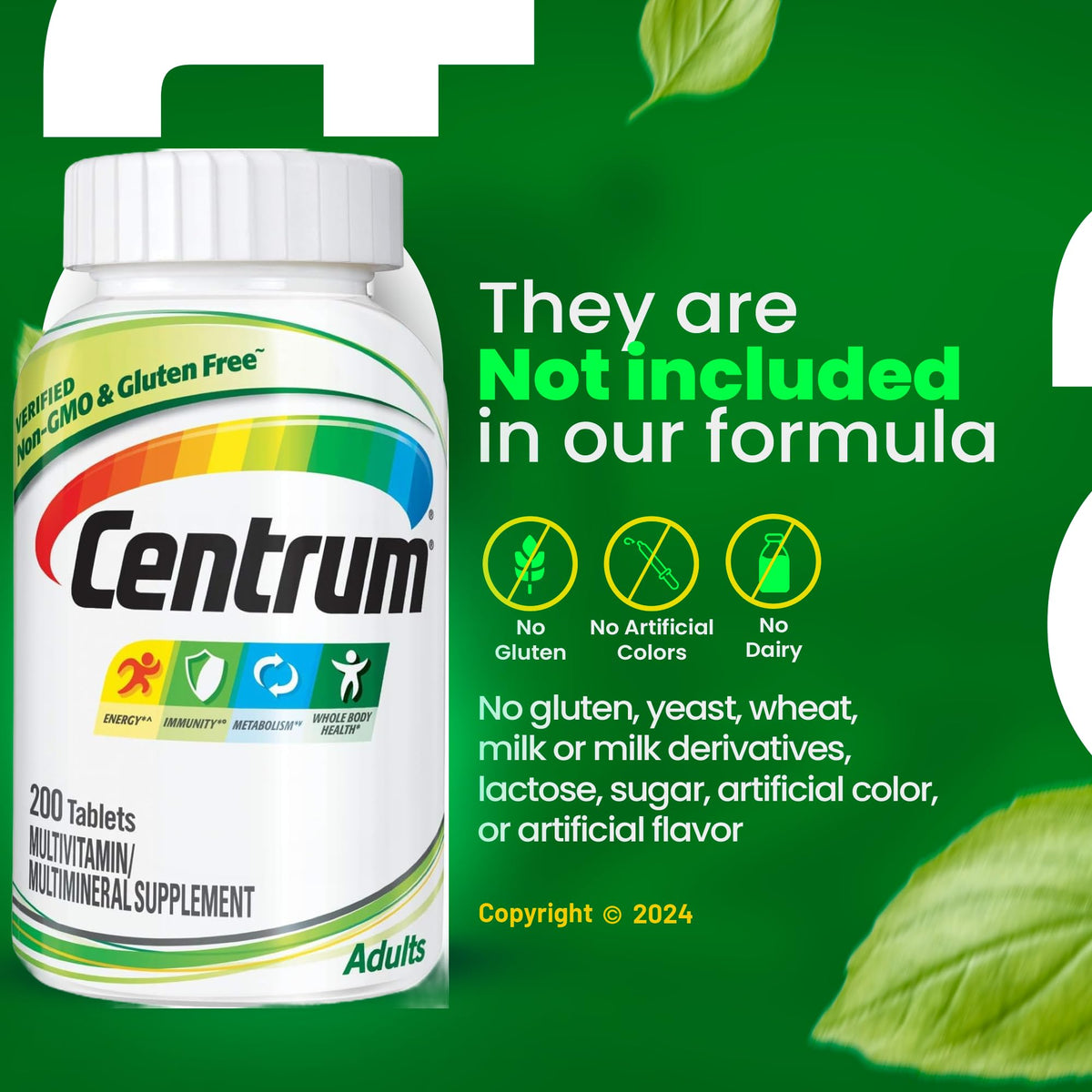 Ingredients: Calcium Carbonate, Potassium Chloride, Dibasic Calcium Phosphate, Magnesium Oxide, Microcrystalline Cellulose, Ascorbic Acid Vit. C, Ferrous Fumarate, dlAlpha Tocopheryl Acetate Vit. E, Maltodextrin. Contains 2 of BetaCarotene, BHT to preserve freshness, Biotin, Calcium Pantothenate, Cholecalciferol Vit. D3, Chromium Picolinate, Corn Starch, Crospovidone, Copper Sulfate, Cyanocobalamin Vit. B12, Folic Acid, Gelatin, Hydrogenated Palm Oil, Magnesium Stearate, Manganese Sulfate, Modified Corn Starch, Niacinamide, Nickelous Sulfate, Phytonadione Vit. K, Polyethylene Glycol, Polyvinyl Alcohol, Potassium lodide, Pregelatinized Corn Starch, Pyridoxine Hydrochloride Vit. B, Riboflavin Vit. B2, Silicon Dioxide, Sodium Ascorbate to preserve freshness, Sodium Metavanadate, Sodium Molybdate, Sodium Selenate, Stannous Chloride, Talc, Thiamine Mononitrate Vit. B1, Titanium Dioxide, Tocopherols to preserve freshness, Vitamin A Acetate, Yellow 6 Lake, Zinc Oxide.