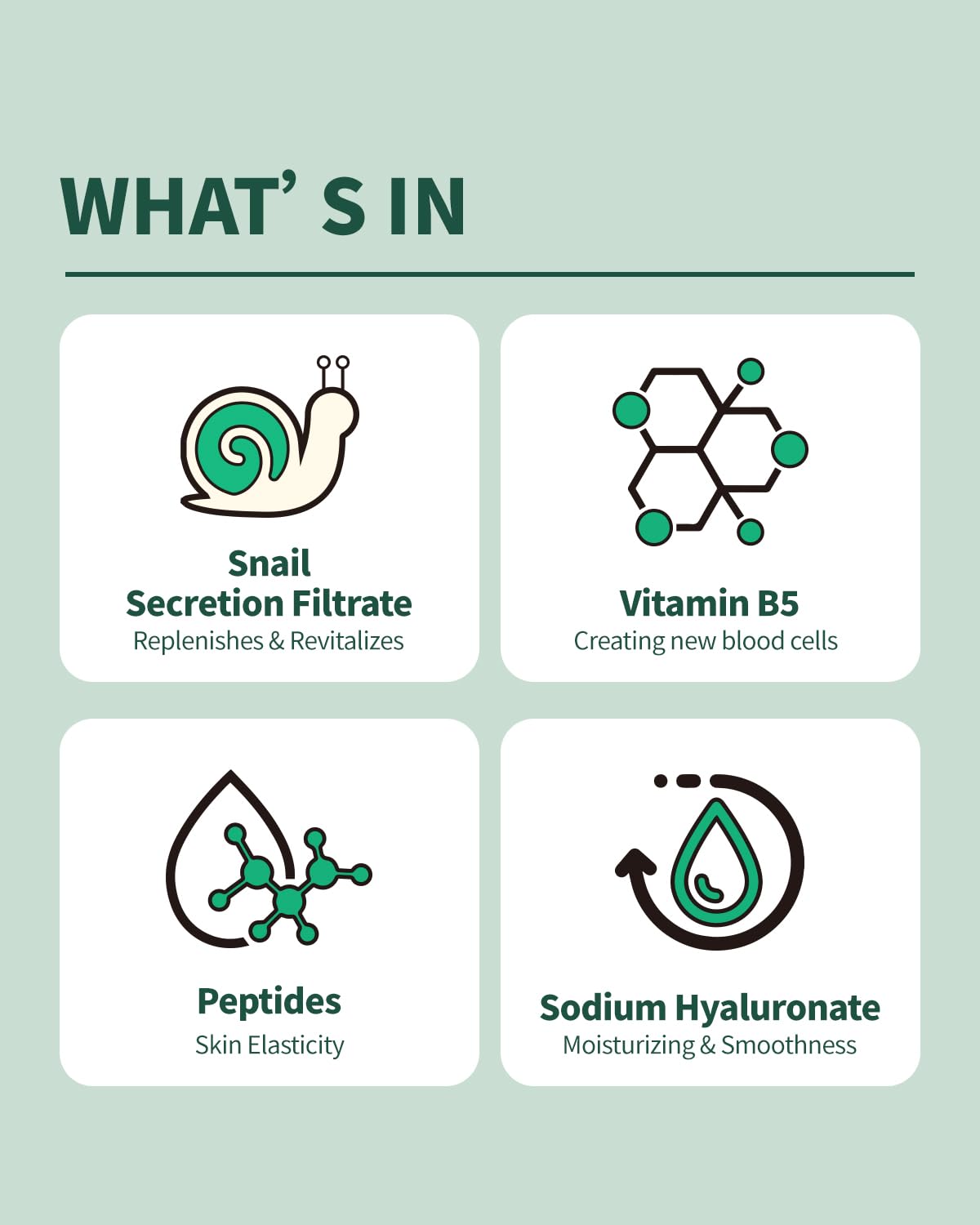 Active Ingredients :: Snail Mucus, Peptide, Hyaluronic Acid