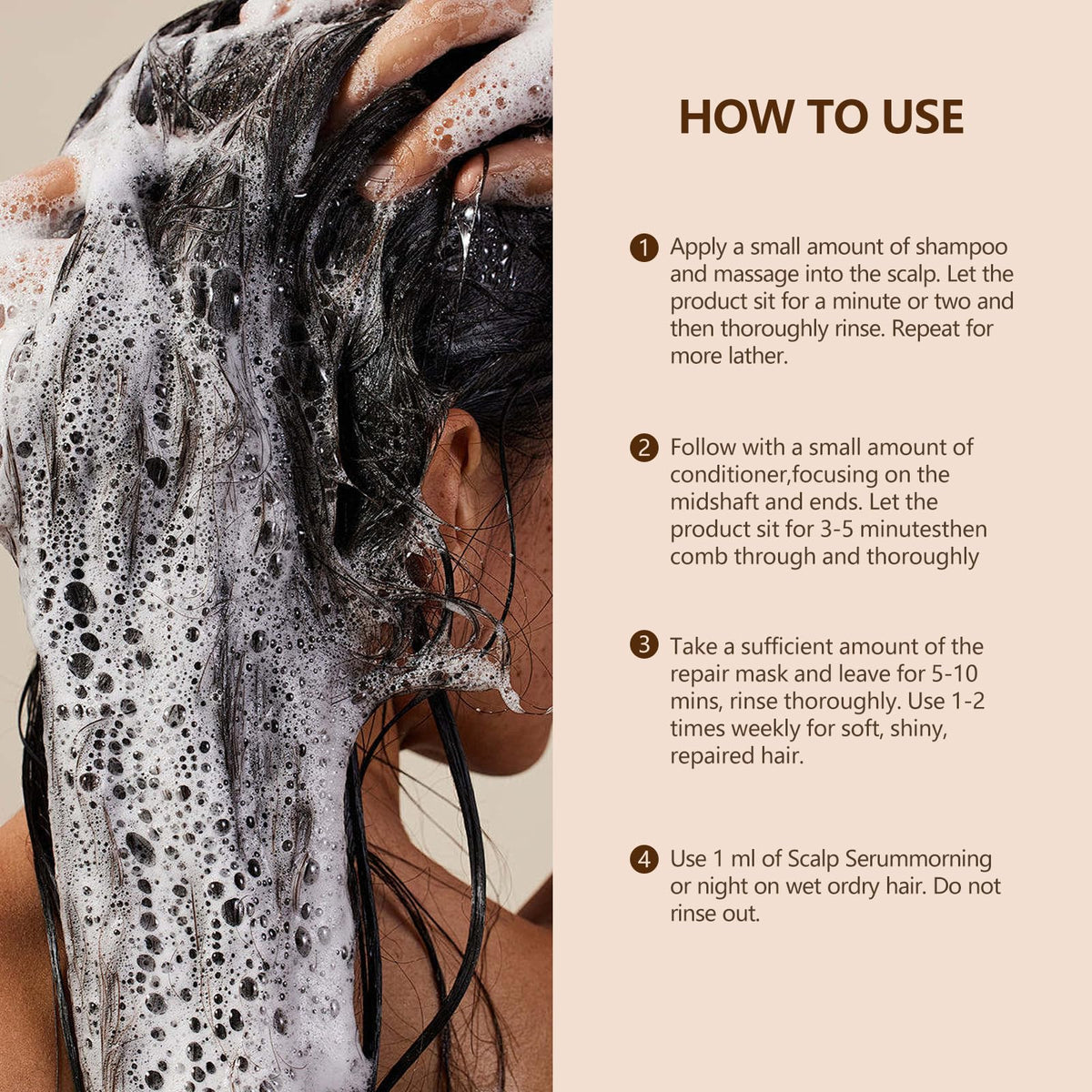Wet hair, apply shampoo, lather, rinse thoroughly. Apply conditioner, let it sit, then rinse again.