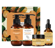 Indulge in luxurious hair care with AESTHTANY Morocco Argan Oil Travel Kit. This 4-piece set includes Rich Moisture Shampoo & Conditioner, Repair Hair Mask, and Hair Care Essential Oil for nourished and revitalized hair.