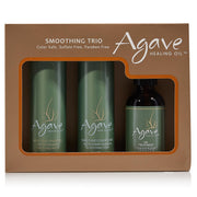 Agave Smoothing Haircare Trio includes Shampoo, Conditioner, and Healing Oil Treatment. This set hydrates, controls frizz, and improves hair texture.