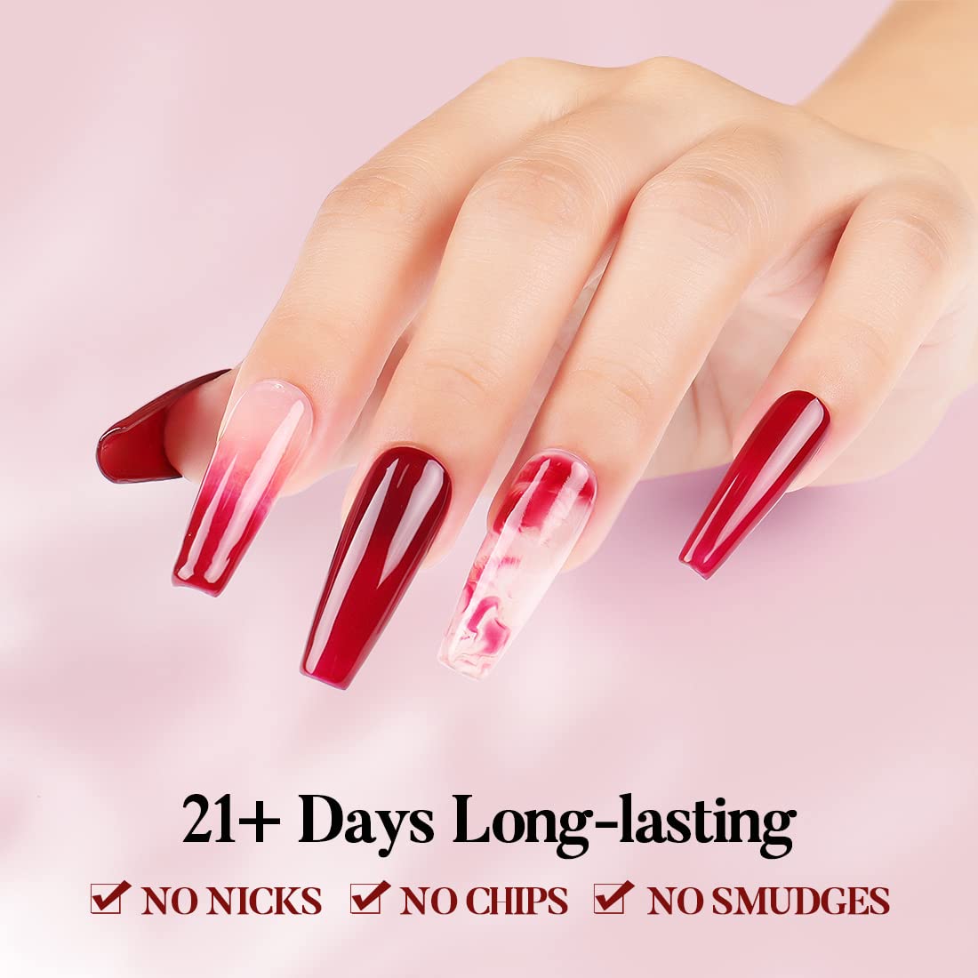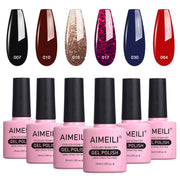Transform your nails with the AIMEILI Gel Nail Polish Set. This kit includes 6 stunning colors in Black, Wine Red, and Blue Glitter, perfect for creating vibrant and long-lasting nail designs.