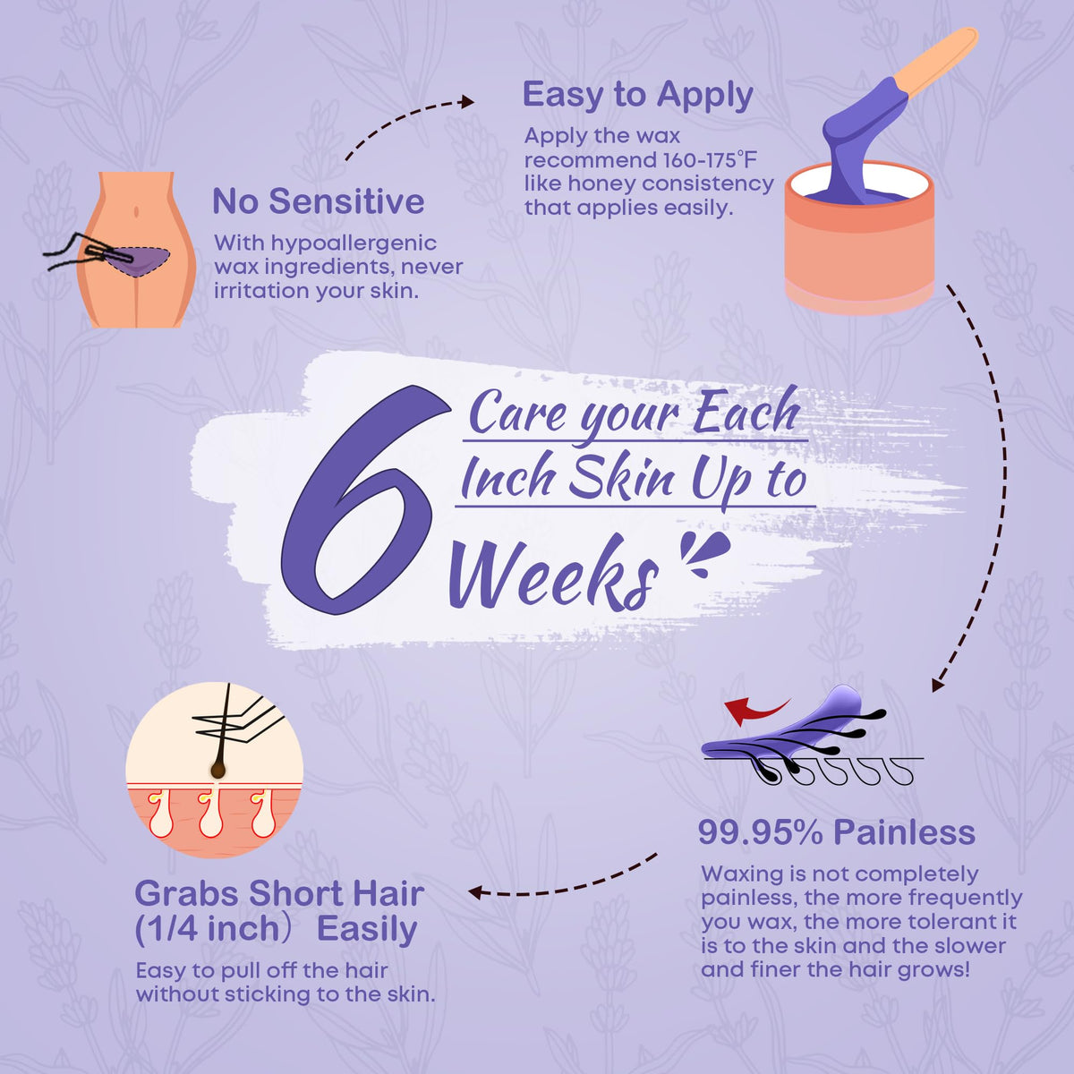 Directions :: Melt wax at low temperature, apply on skin, and remove after a short duration.