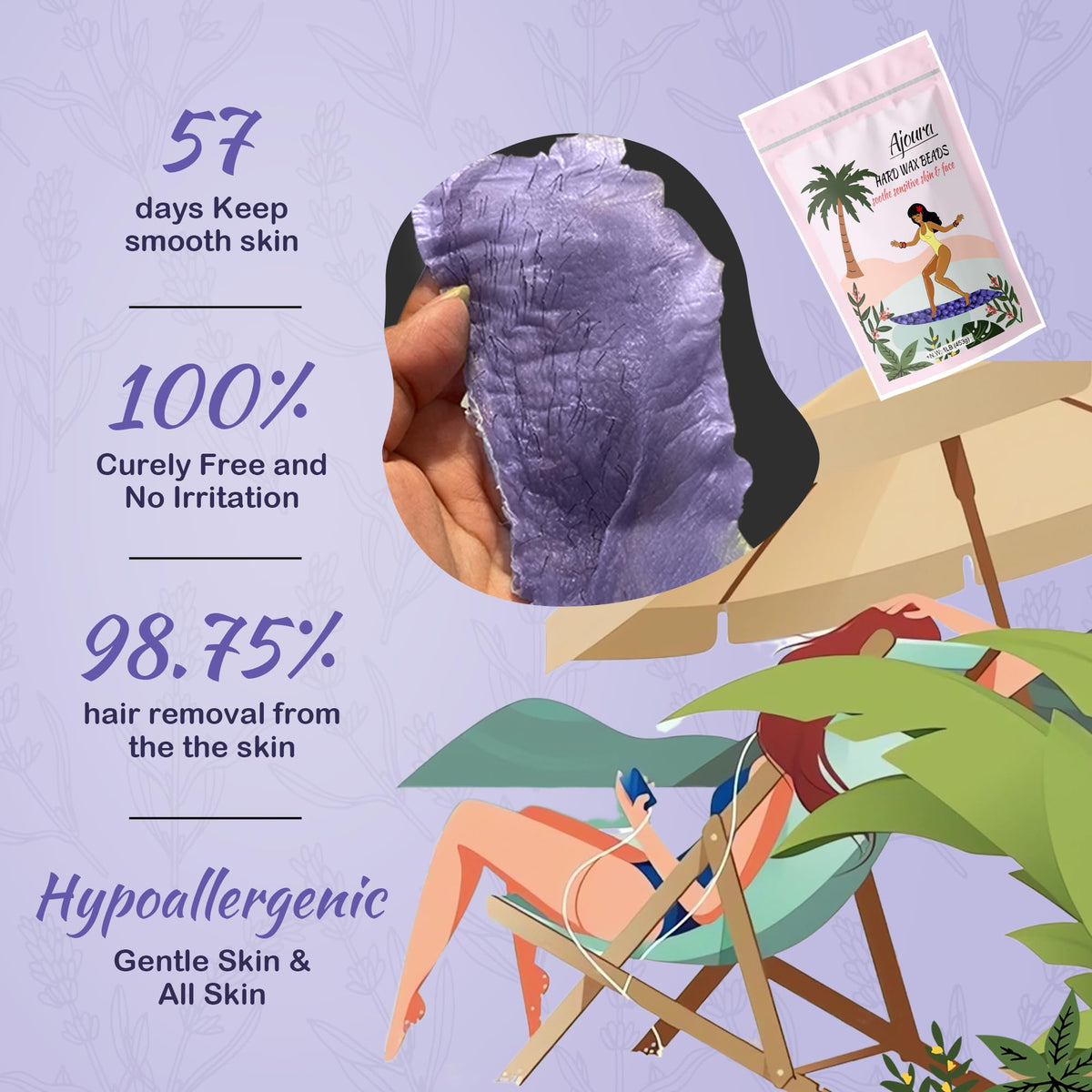 Say goodbye to unwanted hair with Ajoura 1lb Hard Lavender Wax Beads. Perfect for full body hair removal including Brazilian, bikini, face, eyebrows, underarms, arms, chest, back, and legs. Achieve smooth and silky skin effortlessly.