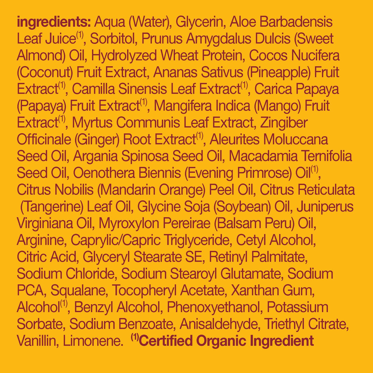 Ingredients: Aqua Water, Glycerin, Aloe Barbadensis Leaf Juice1, Sorbitol, Prunus Amygdalus Dulcis Sweet Almond Oil, Hydrolyzed Wheat Protein, Cocos Nucifera Coconut Fruit Extract, Ananas Sativus Pineapple Fruit Extract1, Camilla Sinensis Leaf Extract1, Carica Papaya Papaya Fruit Extract1, Mangifera Indica Mango Fruit Extract1, Myrtus Communis Leaf Extract, Zingiber Officinale Ginger Root Extract1, Aleurites Moluccana Seed Oil, Argania Spinosa Seed Oil, Macadamia Ternifolia Seed Oil, Oenothera Biennis Evening Primrose Oil1, Citrus Nobilis Mandarin Orange Peel Oil, Citrus Reticulata Tangerine Leaf Oil, Glycine Soja Soybean Oil, Juniperus Virginiana Oil, Myroxylon Pereirae Balsam Peru Oil, Arginine, CaprylicCapric Triglyceride, Cetyl Alcohol, Citric Acid, Glyceryl Stearate SE, Retinyl Palmitate, Sodium Chloride, Sodium Stearoyl Glutamate, Sodium PCA, Squalane, Tocopheryl Acetate, Xanthan Gum, Alcohol1, Benzyl Alcohol, Phenoxyethanol, Potassium Sorbate, Sodium Benzoate, Anisaldehyde, Triethyl Citrate, Vanillin, Limonene. 1Certified organic ingredient.