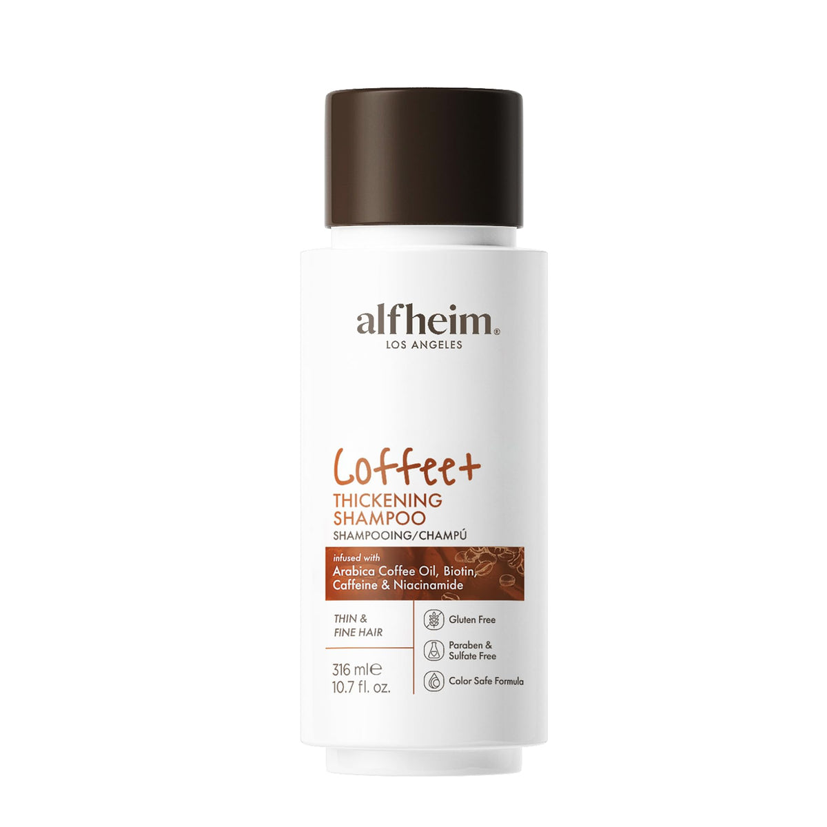 Alfheim Coffee+ Thickening Shampoo combines the power of caffeine and biotin to promote hair growth and strength. This volumizing and moisturizing formula is designed for fine and thinning hair, offering a sulfate-free and color-safe solution for healthier and fuller-looking hair.