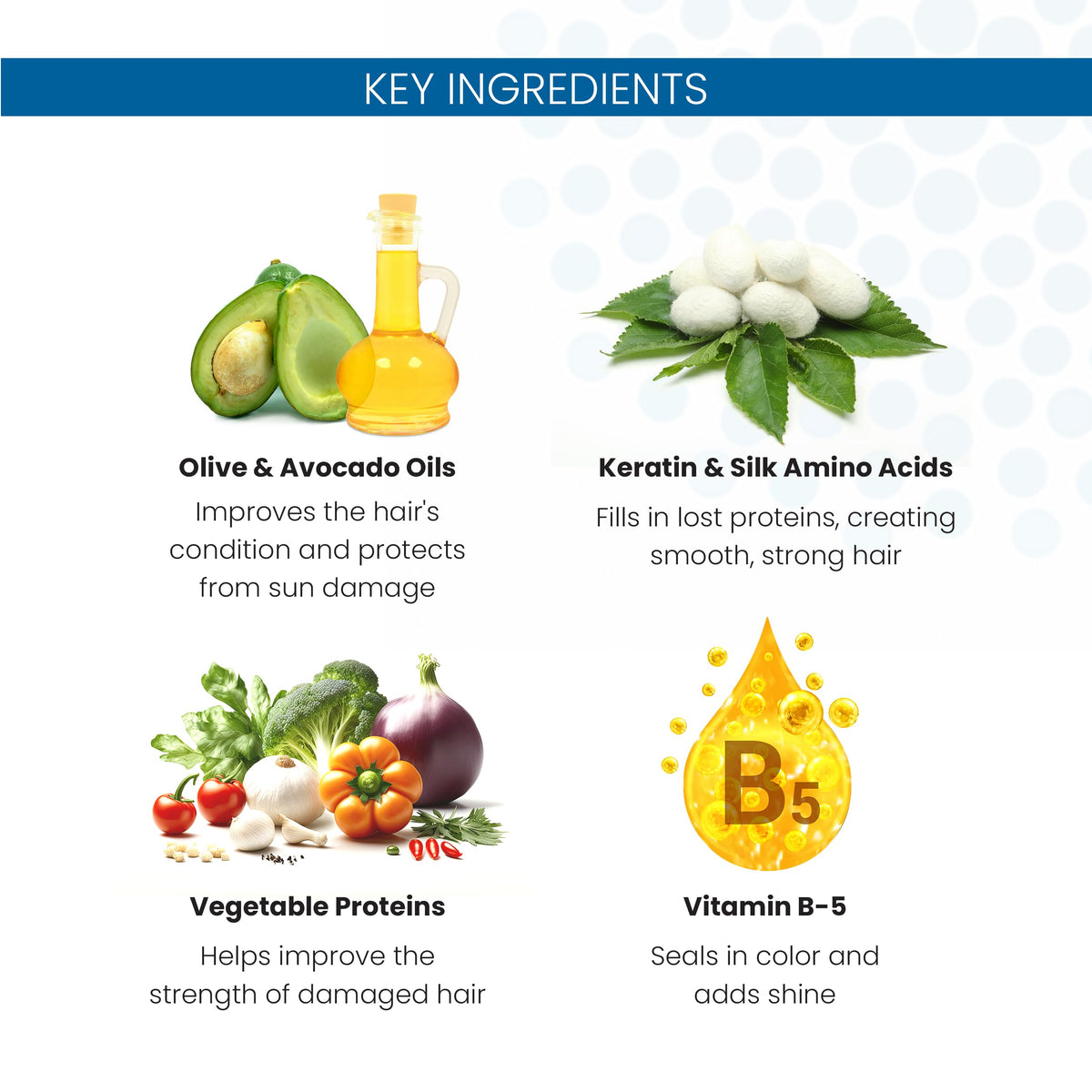 Ingredients :: OLIVE & AVOCADO OILS, PLANT-BASED KERATIN & SILK AMINO ACIDS, VEGETABLE PROTEINS, VITAMIN B-5, COLOURCARE COMPLEX.