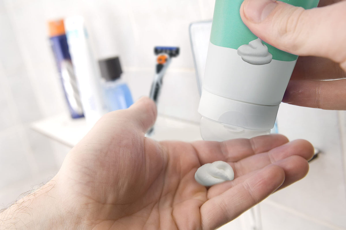 Dispense a suitable amount of shave cream, lather it, and apply it to the shaving area.