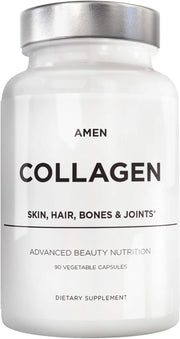 Amen Multi Collagen Peptides Capsules combine the benefits of collagen protein types I, II, III, V, and X with hyaluronic acid and vitamin C. These 90 pills provide essential amino acids for overall collagen support.