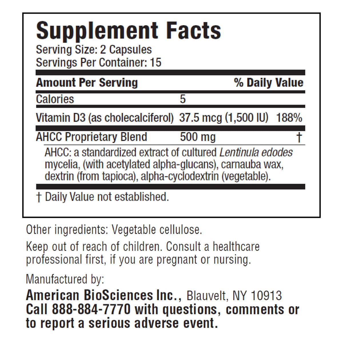 Ingredients: Vitamin D3 as cholecalciferol AHCC Proprietary BlendAHCC a standardized extract of cultured Lentinula edodes mycelia, with acetylated alphaglucans, carnauba wax, dextrin from tapioca, alphacyclodextrin vegetable, Other ingredients Vegetable cellulose.