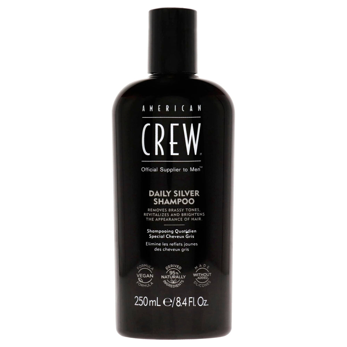 American Crew Men's Shampoo, Daily Silver, effectively removes brassy tones while providing a naturally derived, vegan formula in an 8.4 Fl Oz bottle.