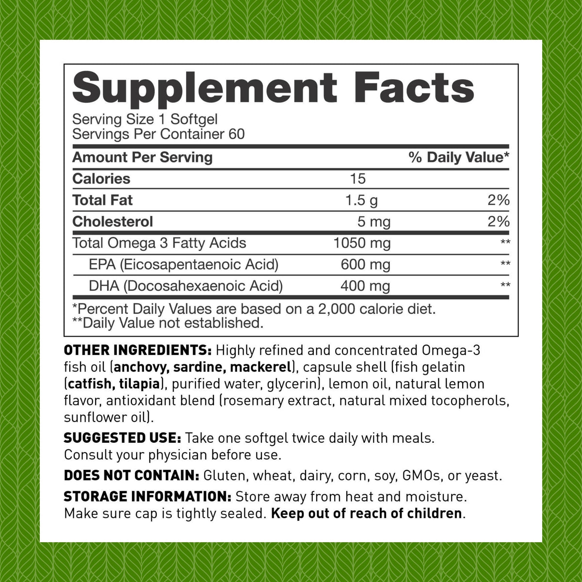 Ingredients: EPA Eicosapentaenoic Acid, DHA Docosahexaenoic Acid. OTHER INGREDIENTS Highly refined and concentrated Omega3 fish oil anchovy, sardine, mackerel, capsule shell fish gelatin catfish, tilapia, purified water, glycerin, lemon oil, natural lemon flavor, antioxidant blend rosemary extract, natural mixed tocopherols, sunflower oil.