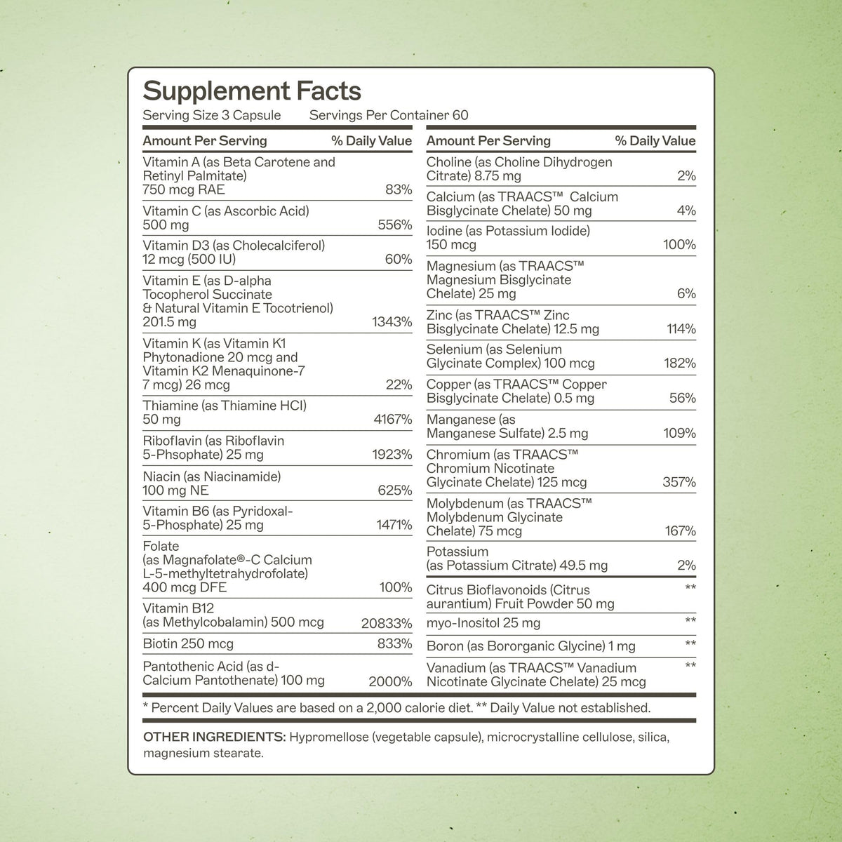 Ingredients: Vitamin A, Vitamin C, Vitamin D, Vitamin E, Vitamin K, Thiamine, Riboflavin, Niacin, Vitamin B6, Folate, Vitamin B12, Biotin, Pantothenic Acid, Choline, Calcium, Iodine, Magnesium, Zinc, Selenium, Cooper, Manganese,Chromium, Molybdenum, Potassium, Citrus Bioflavonoids, myoinositol, Boron, vanadium. OTHER INGREDIENTS Hypromellose vegetable capsule, microcrystalline cellulose, silica, magnesium stearate.