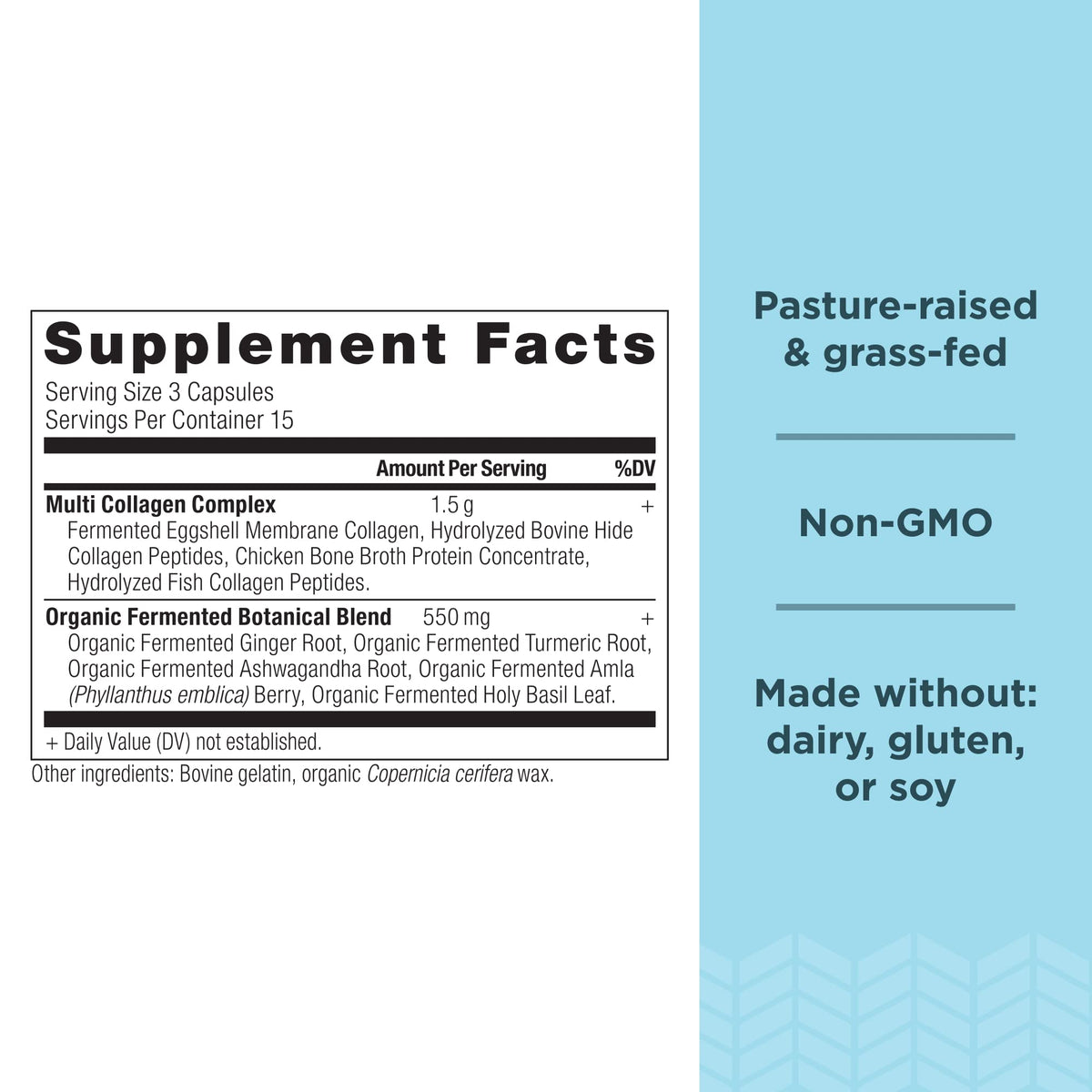Ingredients :: Fermented Eggshell Membrane Collagen, Hydrolyzed Bovine Hide Collagen Peptides, Chicken Bone Broth Protein Concentrate, Hydrolyzed Fish Collagen Peptides, Organic Fermented Ginger Root, Organic Fermented Turmeric Root, Organic Fermented Ashwagandha Root, Organic Fermented Amla (Phyllanthus emblica) Berry, Organic Fermented Holy Basil Leaf, Gelatin