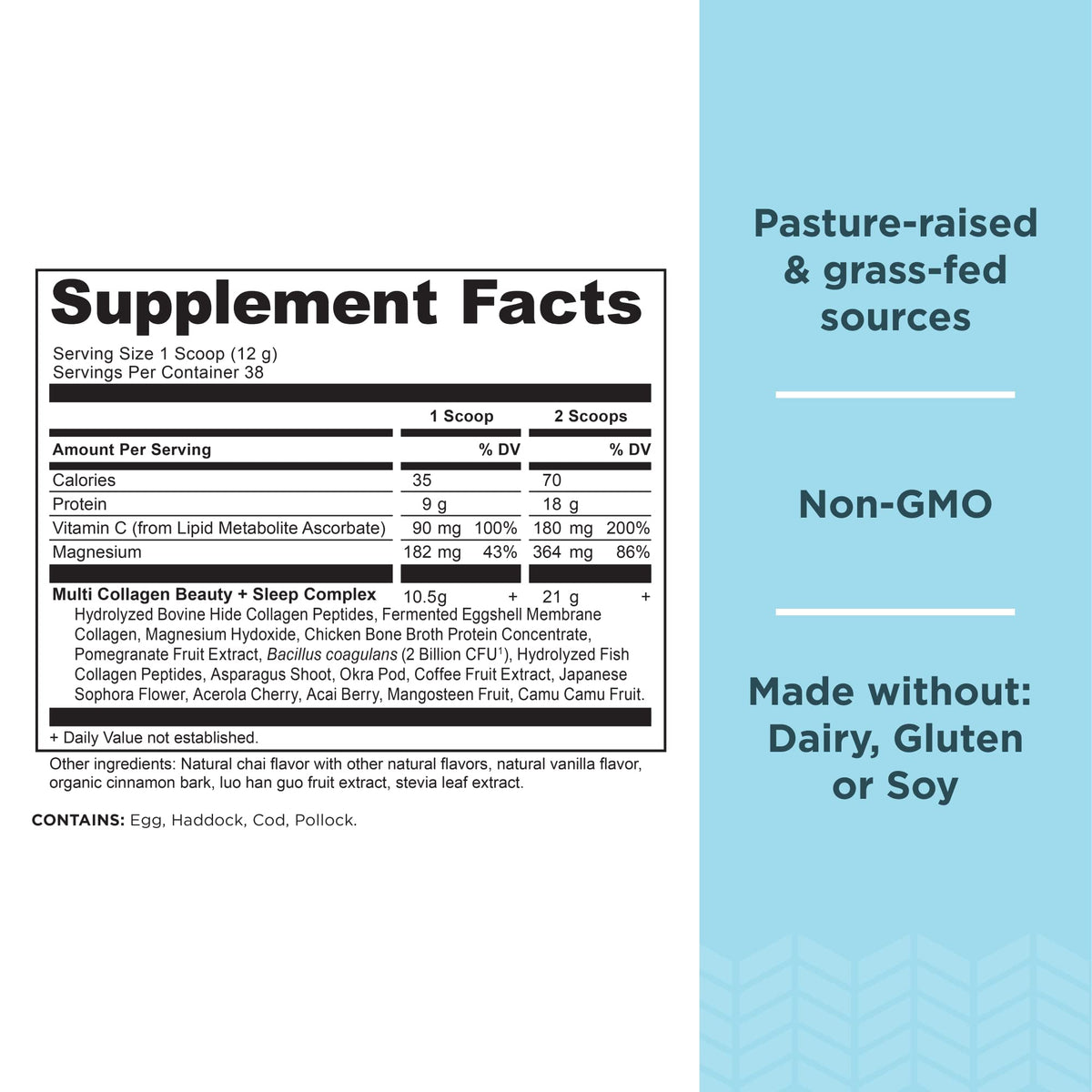 Ingredients: Hydrolyzed Bovine Hide Collagen Peptides, Fermented Eggshell Membrane Collagen, Magnesium Hydoxide, Chicken Bone Broth Protein Concentrate, Pomegranate Fruit Extract, Bacillus Coagulans 2 Billion CFU, Hydrolyzed Fish Collagen Peptides, Asparagus Shoot, Okra Pod, Coffee Fruit Extract, Japanese Sophora Flower, Acerola Cherry, Acai Berry, Mangosteen Fruit, Camu Camu Fruit, Natural chai flavor with other natural flavor, organic cinnamon bark powder, luo han guo fruit extract, stevia leaf extract