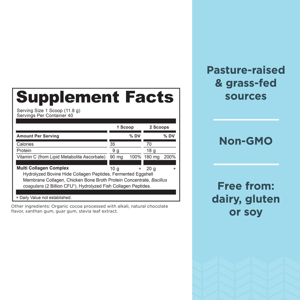 Ingredients: Hydrolyzed Bovine Collagen Peptides, Fermented Eggshell Membrane Collagen, Chicken Bone Broth Protein Concentrate, Bacillus coagulans 2 Billion CFU, Hydrolyzed Fish Collagen Peptides, Other ingredients Organic cocoa processed with alkali, natural chocolate flavor, xanthan gum, guar gum, stevia leaf extract.