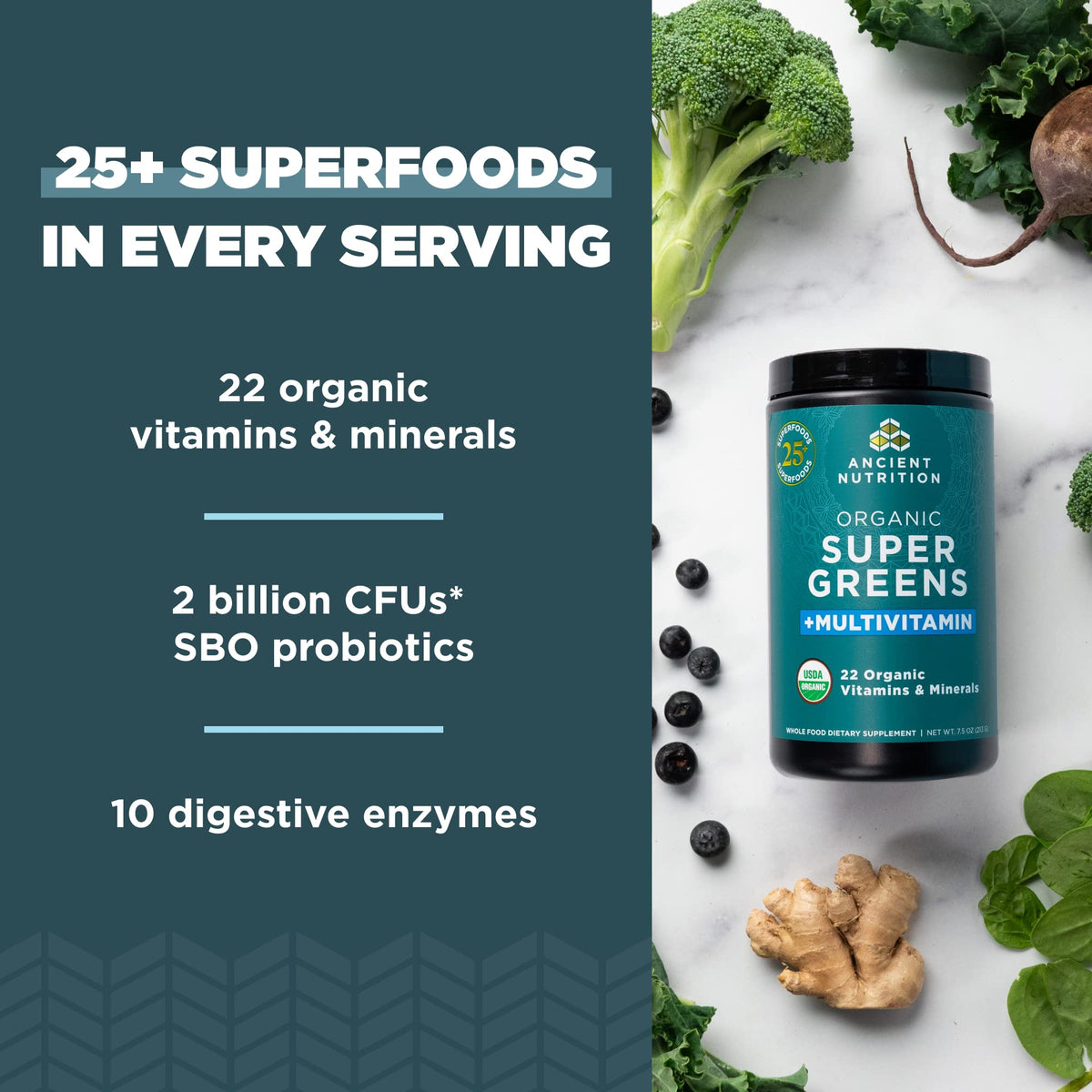 Ancient Nutrition Organic SuperGreens and Multivitamin Powder with Probiotics, Made from Real Fruits, Vegetables and Herbs, for Digestive, Detoxification and Energy Support, 25 Servings