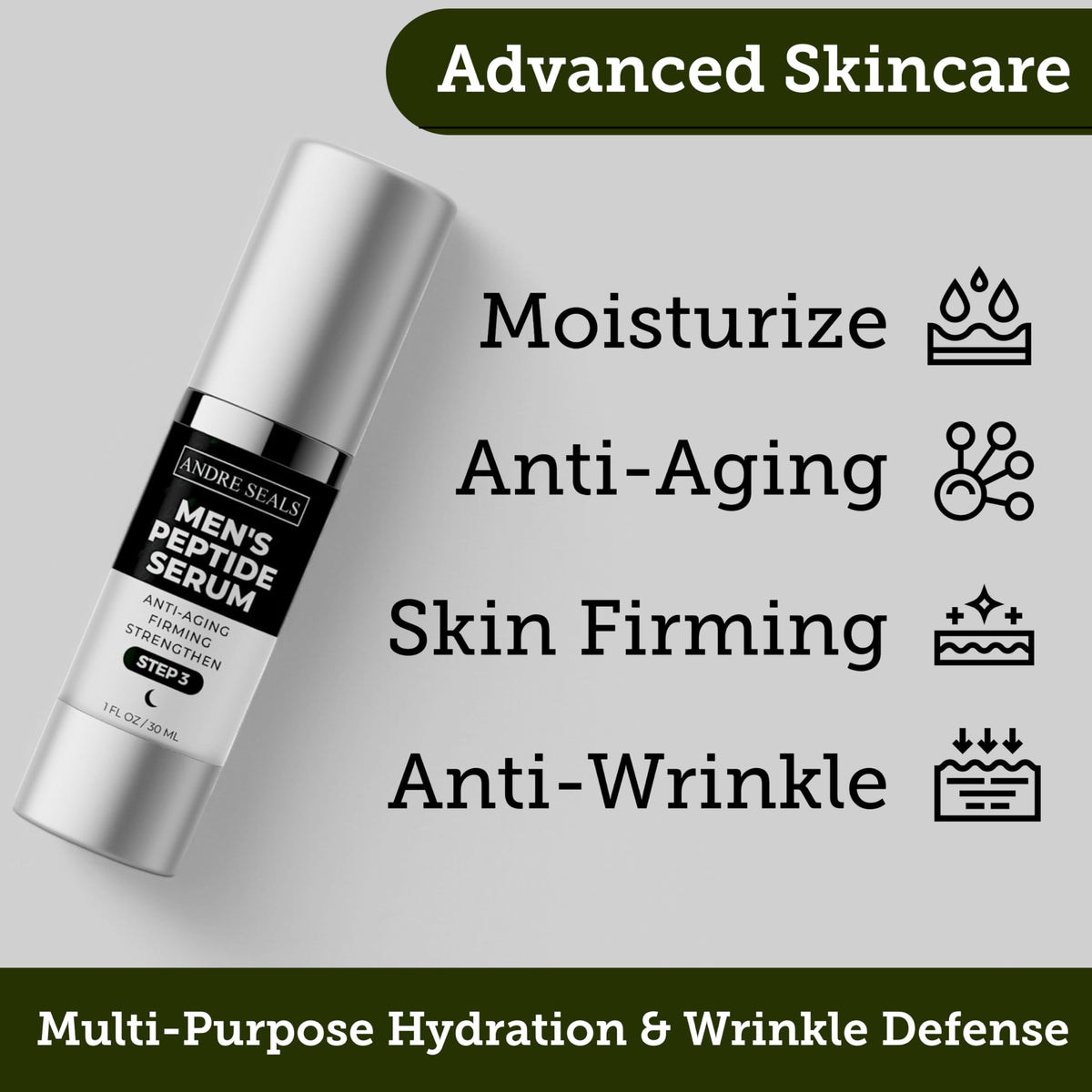 Andre Seals Face Serum for Men - Anti-Aging, Wrinkle Reduction & Collagen Boost with Multi-Peptide, Hyaluronic Acid, Green Tea & Vitamin E | Mens Skincare | 1oz | Night Time Face Serum