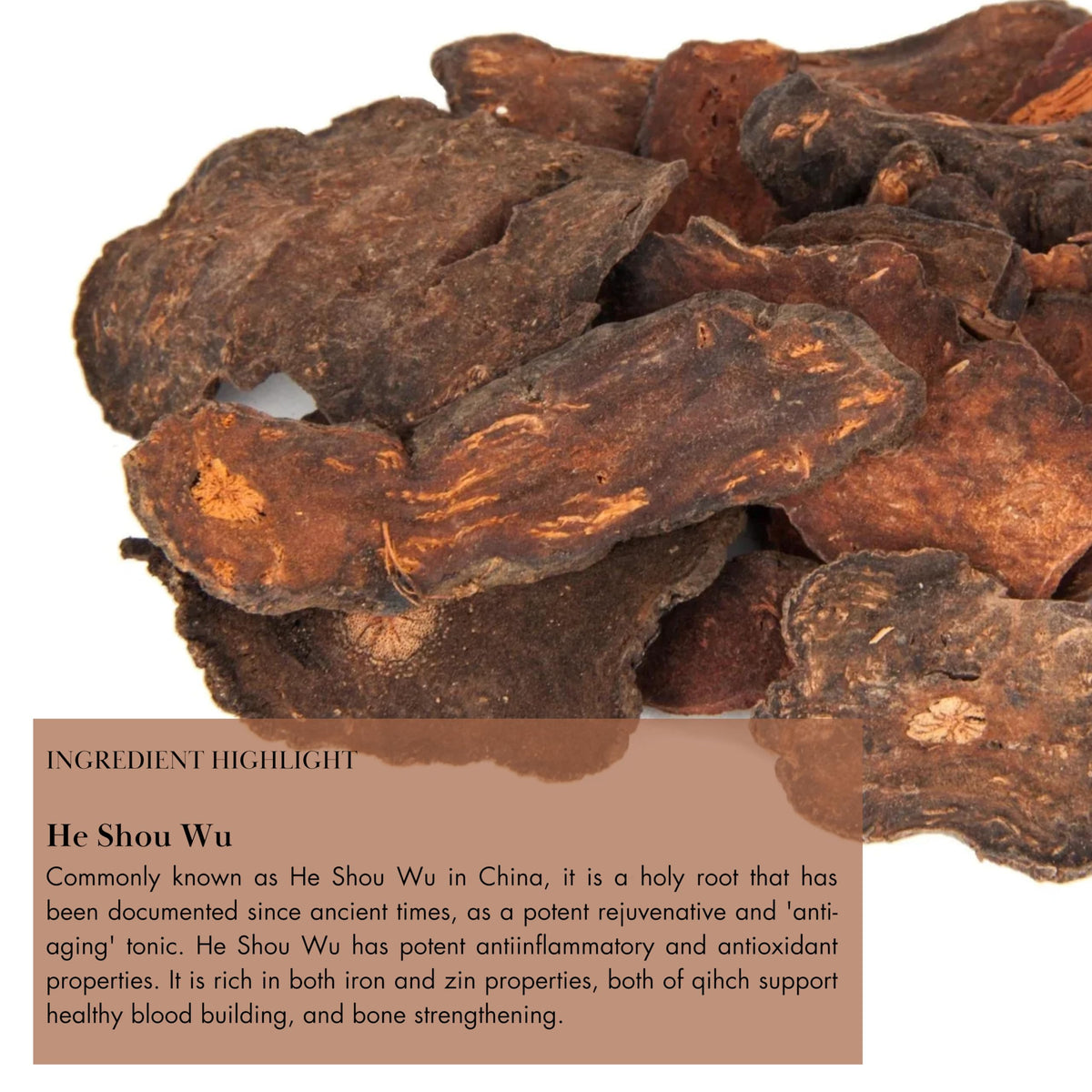 Ingredients: Actives He Shou Wu extract powder, Horsetail extract powder, Nettles, Gynostemma, Lucuma, Rose Petals, Cardamom, Cinnamon, Calendula, Turmeric, Vanilla, Mangosteen