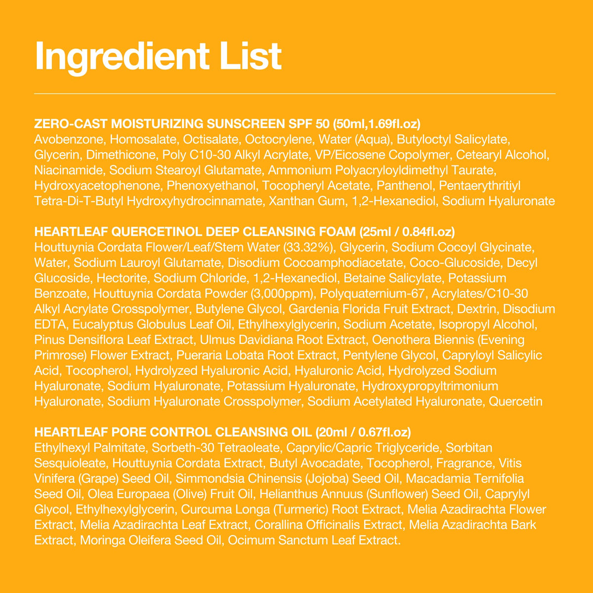 This set includes ANUA ZERO-CAST MOISTURIZING FINISH SUNSCREEN (50ml), ANUA HEARTLEAF PORE CONTROL CLEANSING OIL (20ml), and ANUA HEARTLEAF QUERCETINOL PORE DEEP CLEANSING FOAM (25ml).