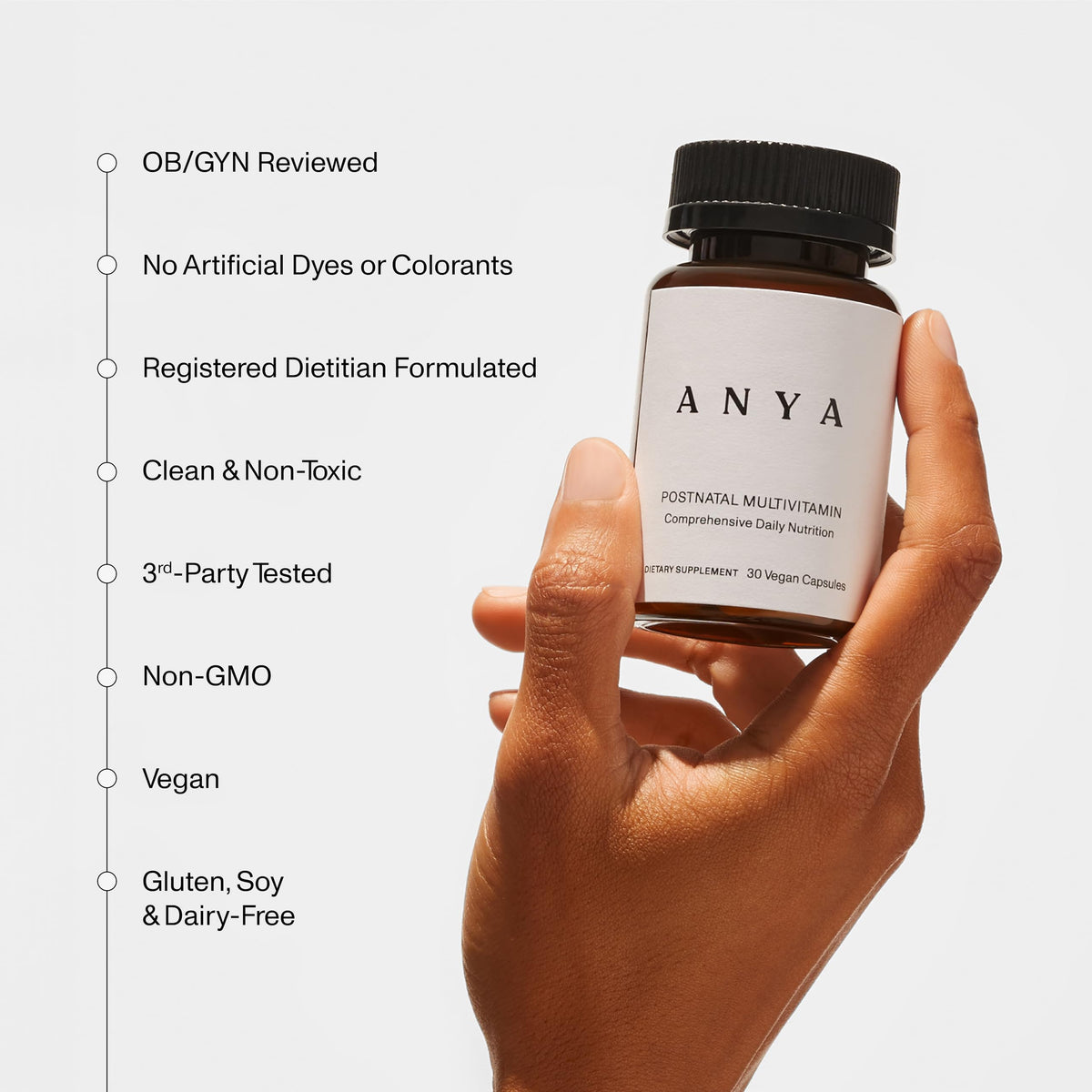 ANYA Postpartum Multivitamin, Postnatal Vitamin for Women Breastfeeding Support, 30 Capsules - Vitamins A, C, D3, Zinc, Methyl B12, Biotin, Folate and Iron - 100% Vegan, Non-GMO, Gluten & Dairy Free