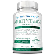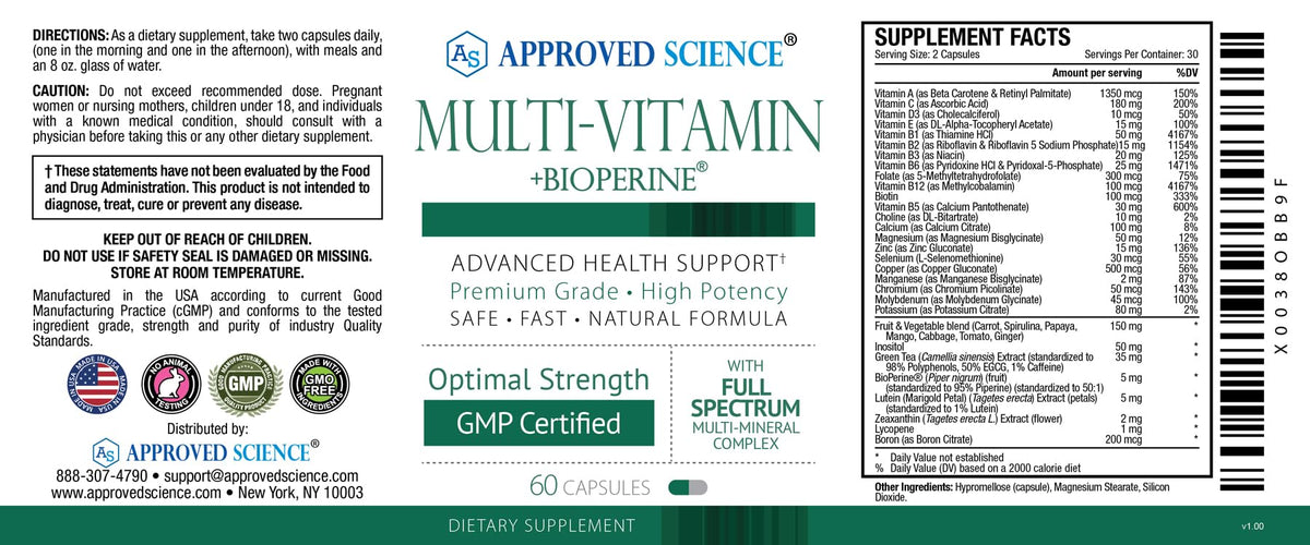 Approved Science Multi-Vitamin is a comprehensive blend of essential nutrients including B-Vitamins, Green Tea, and antioxidants like Lutein and Lycopene. This 1-month supply of 60 capsules is designed to support overall health and vitality.