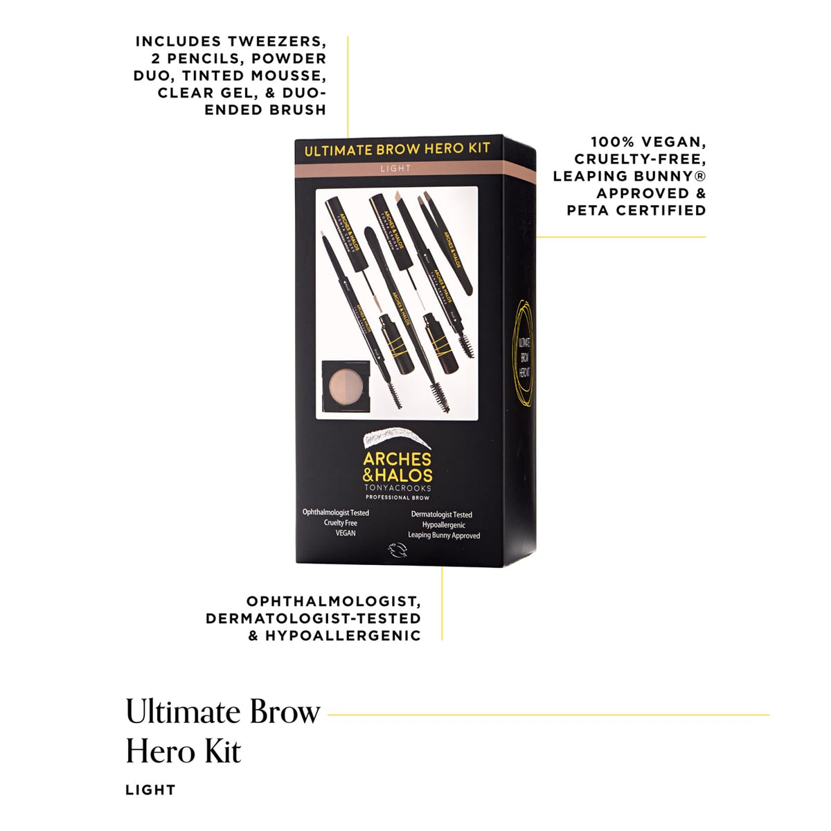 Create perfect eyebrows with the Arches and Halos Ultimate Brow Hero Kit in Light. This professional-grade kit includes essential tools like a pencil, powder, spoolie, brush, and tweezer for flawless and well-defined brows.