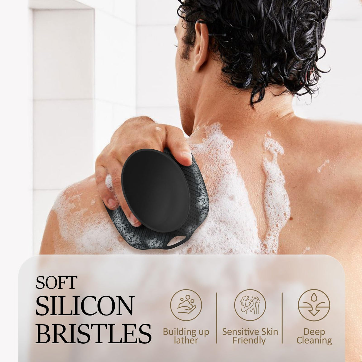 Wet the silicone body scrubber, then put soap on and create lather by moving it back and forth across your skin. It will provide a gentle massage.