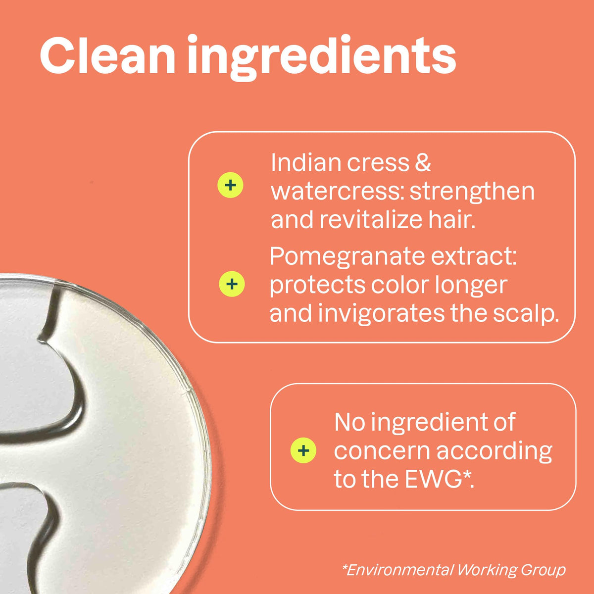 Ingredients: Water, Sodium CocoSulfate, CocoGlucoside, Vegetable Glycerin, Sodium Cocoyl Isethionate, Citric Acid, Panthenol Vitamin B5, Glyceryl Oleate, Cyamopsis Tetragonoloba Guar Gum, Sodium Benzoate, Inulin, Potassium Sorbate, Nasturtium Officinale WatercressCresson Extract, Tropaeolum Majus Indian CressCapucine Extract, Sodium Chloride, Maltodextrin, Moringa Oleifera Seed Extract, Punica Grantum PomegranateGrenade Extract, Persea Gratissina AvocadoAvocat Oil, Isobornyl Acetate Fragrance, TransAnethole Fragrance, Triethyl Citrate Fragrance, Hexenyl Acetate Fragrance, Linalyl Acetate Fragrance, Fragrance Parfum.