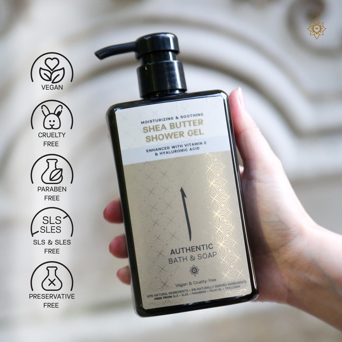 AUTHENTIC BATH & SOAP All Natural Shea Butter Body Oil is a moisturizing and hydrating shower gel enriched with Vitamin E & Hyaluronic Acid. This cruelty-free and vegan gel is suitable for both men and women. Enjoy the paraben-free formula in a generous 16.9 Fl Oz size.