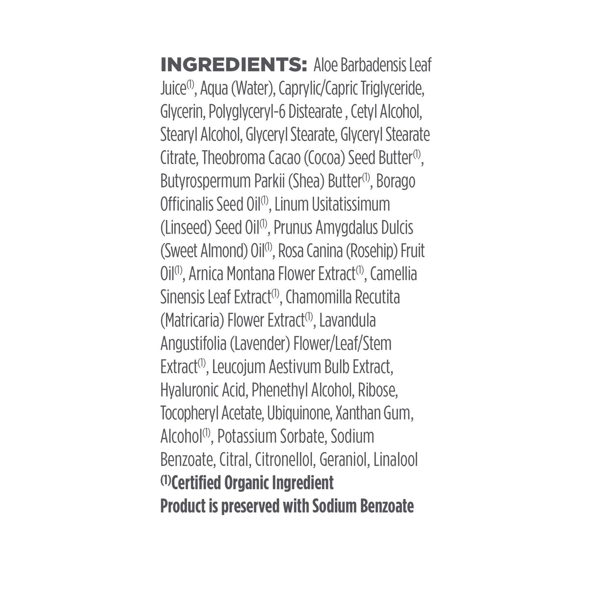 Ingredients: Aloe Barbadensis Leaf Juice1, Aqua Water, CaprylicCapric Triglyceride, Glycerin, Polyglyceryl6 Distearate, Cetyl Alcohol, Stearyl Alcohol, Glyceryl Stearate, Glyceryl Stearate Citrate, Theobroma Cacao Cocoa Seed Butter1, Butyrospermum Parkii Shea Butter1, Borago Officinalis Seed Oil1, Linum Usitatissimum Linseed Seed Oil1, Prunus Amygdalus Dulcis Sweet Almond Oil1, Rosa Canina Rosehip Fruit Oil1, Arnica Montana Flower Extract1, Camellia Sinensis Leaf Extract1, Chamomilla Recutita Matricaria Flower Extract1, Lavandula Angustifolia Lavender FlowerLeafStem Extract1, Leucojum Aestivum Bulb Extract, Hyaluronic Acid, Phenethyl Alcohol, Ribose, Tocopheryl Acetate, Ubiquinone, Xanthan Gum, Alcohol1, Potassium Sorbate, Sodium Benzoate, Citral, Citronellol, Geraniol, Linalool. 1Certified organic ingredient.