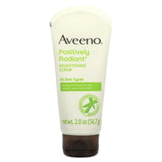 Reveal radiant skin with Aveeno Positively Radiant Skin Brightening Exfoliating Daily Facial Scrub. This 2 oz scrub with moisture-rich soy extract improves skin tone and texture, leaving your skin oil- and soap-free, hypoallergenic, and travel-friendly.