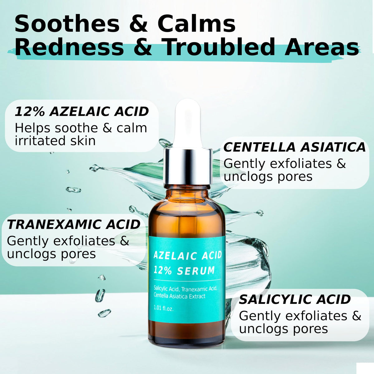 Transform your skincare routine with Azelaic Acid 12% Facial Serum. This Korean skincare serum is specially formulated to provide rapid relief for rosacea, reduce acne scars and pigmentation, soothe redness, and address various skin concerns for sensitive skin types.